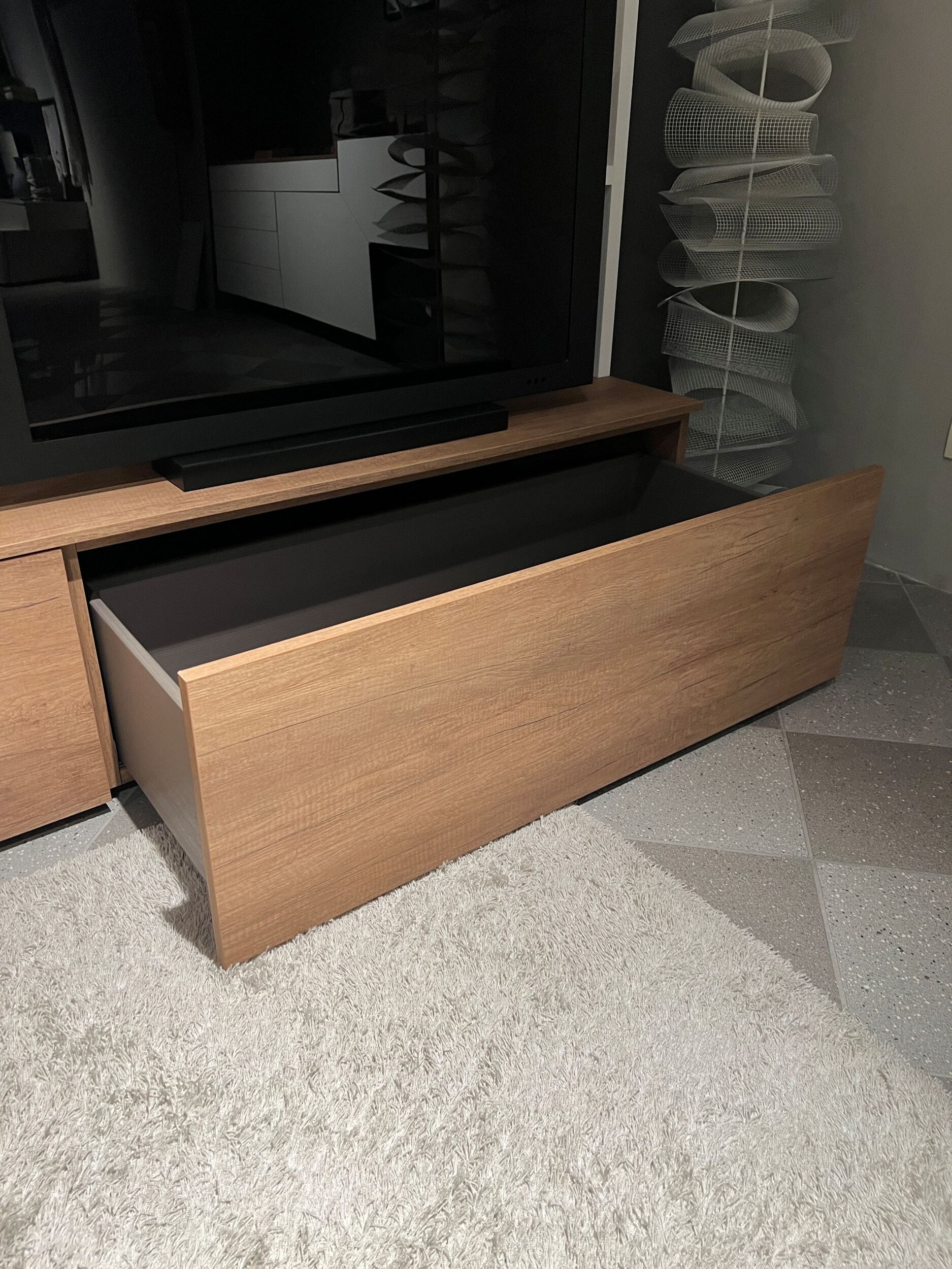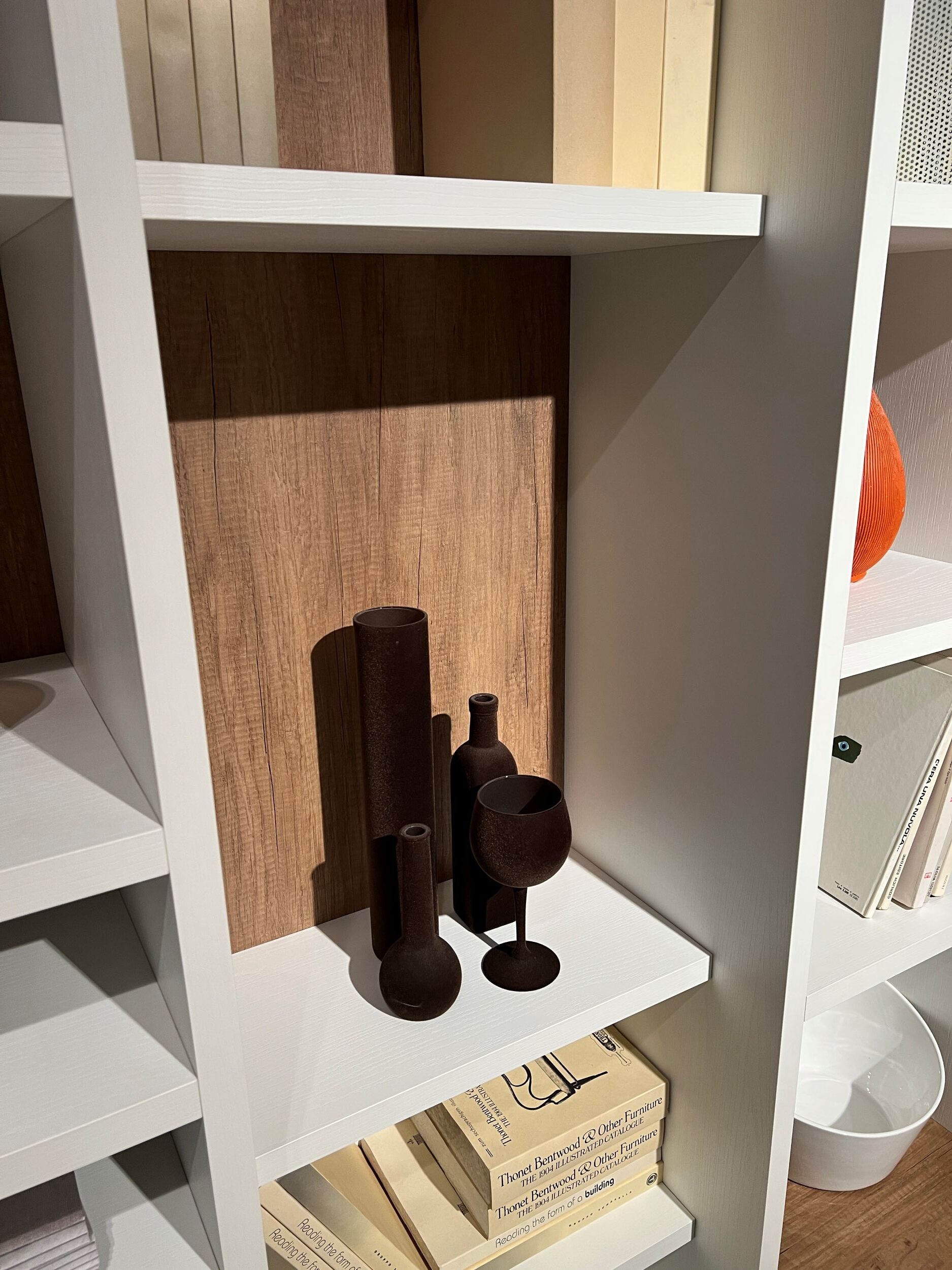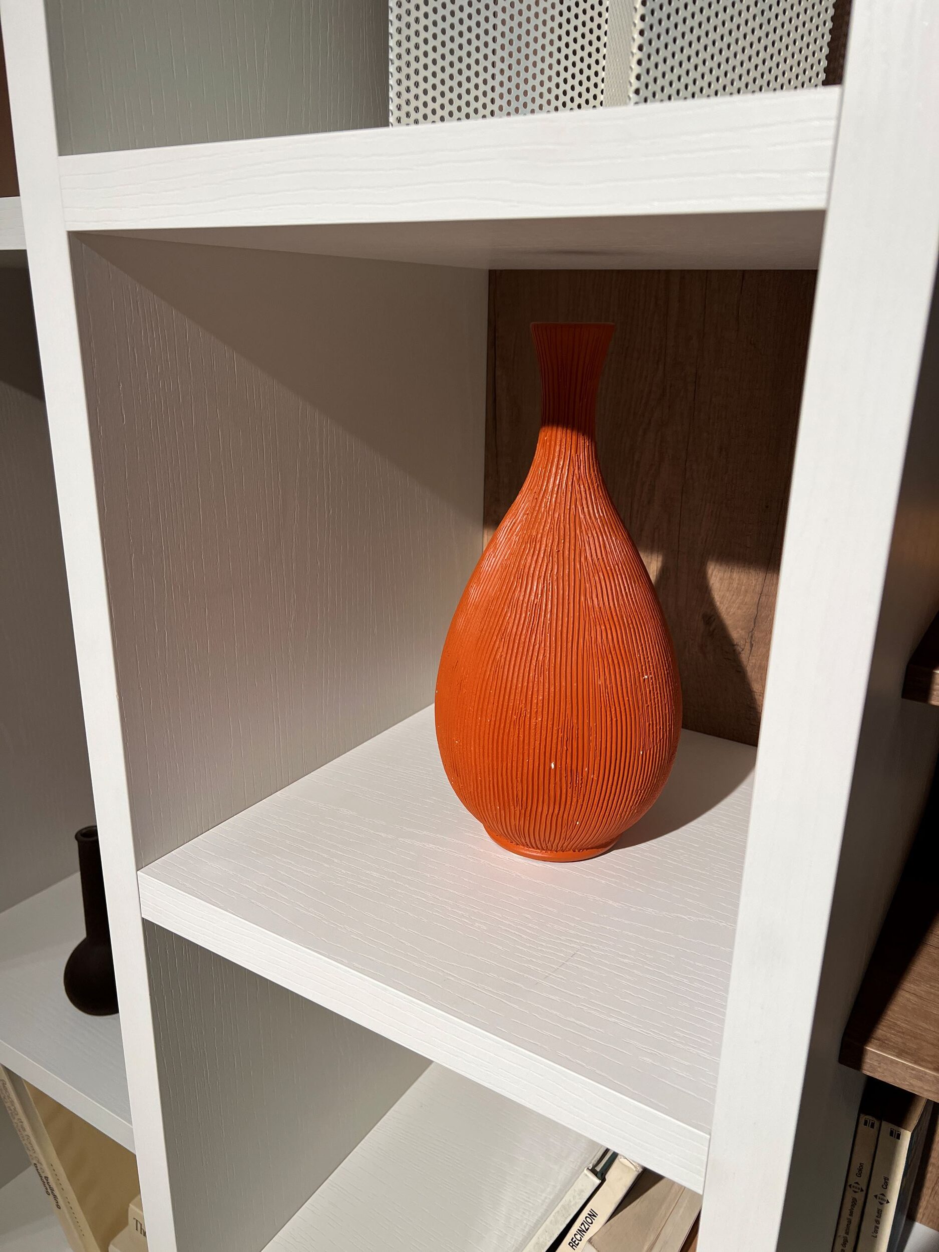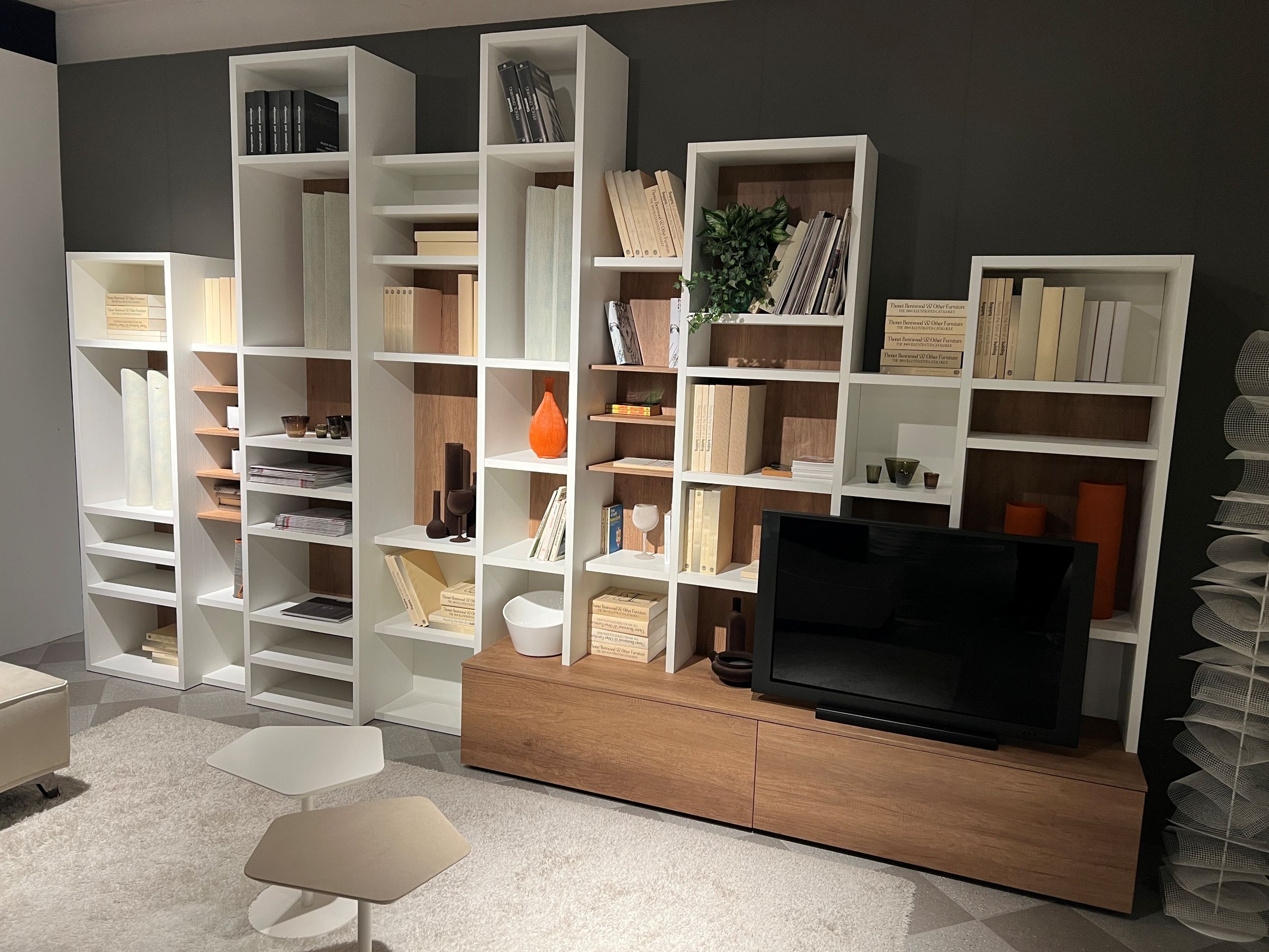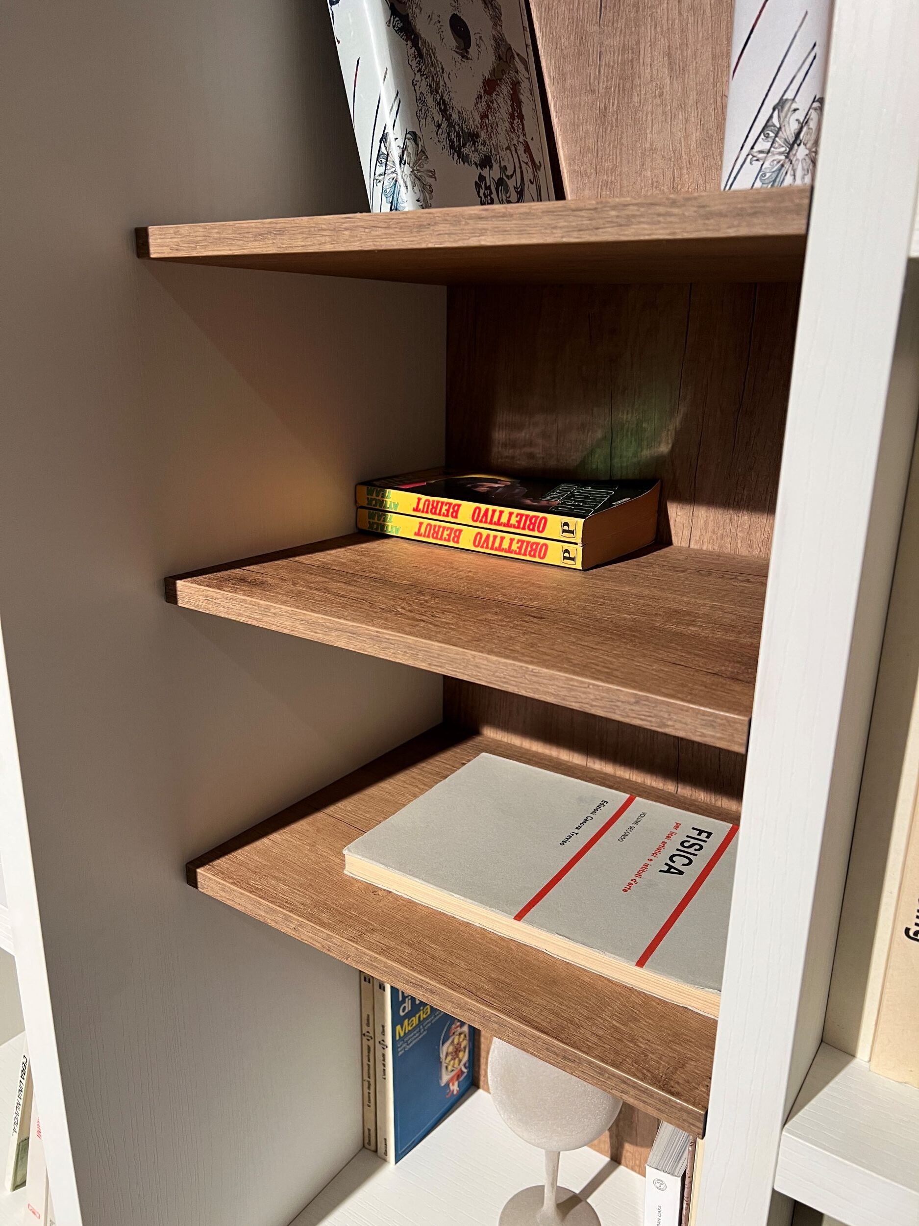 MISURE: L 417 cm – H 255,5 cm – P 28-38-51 cm. Spessore struttura e ripiani bianchi 3 cm, spessore ripiani in legno 1,4 cm.
