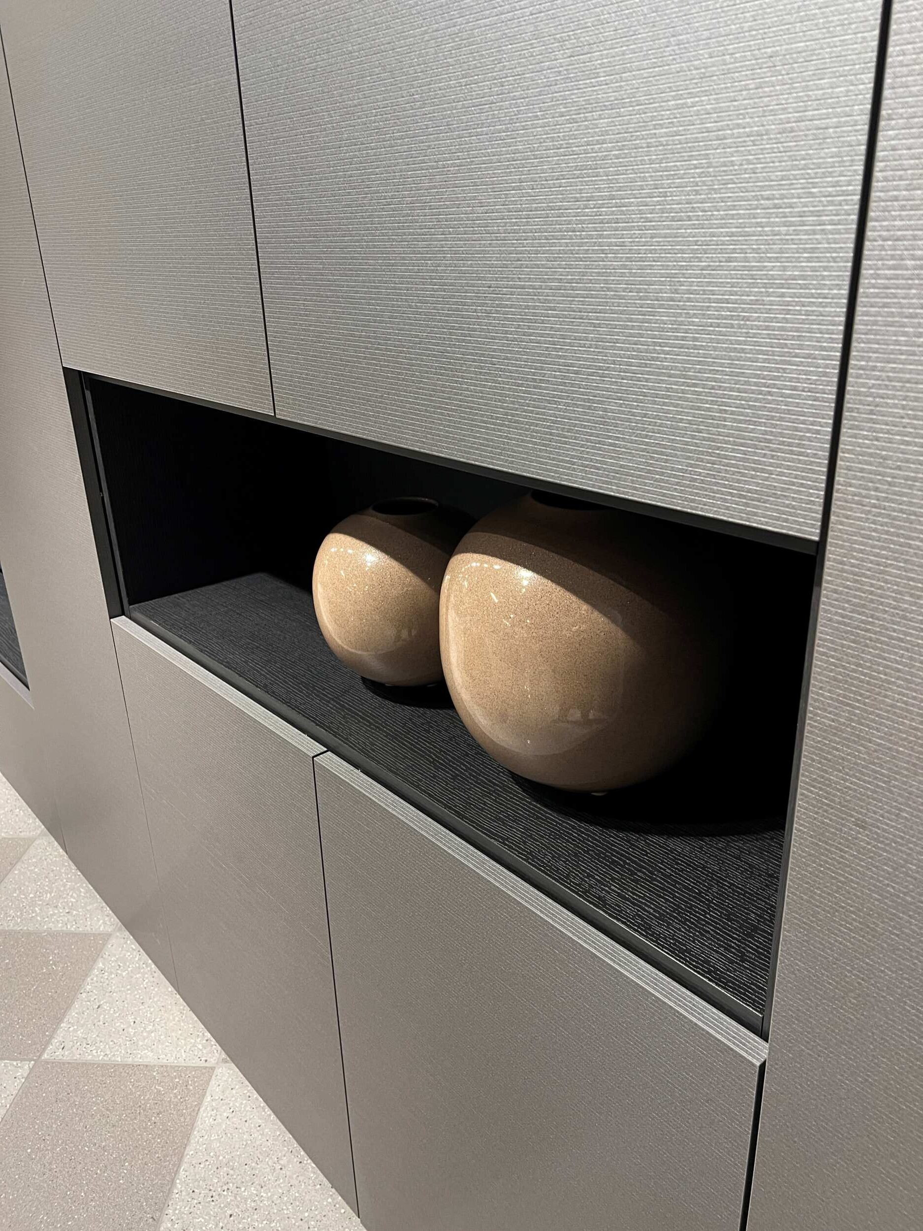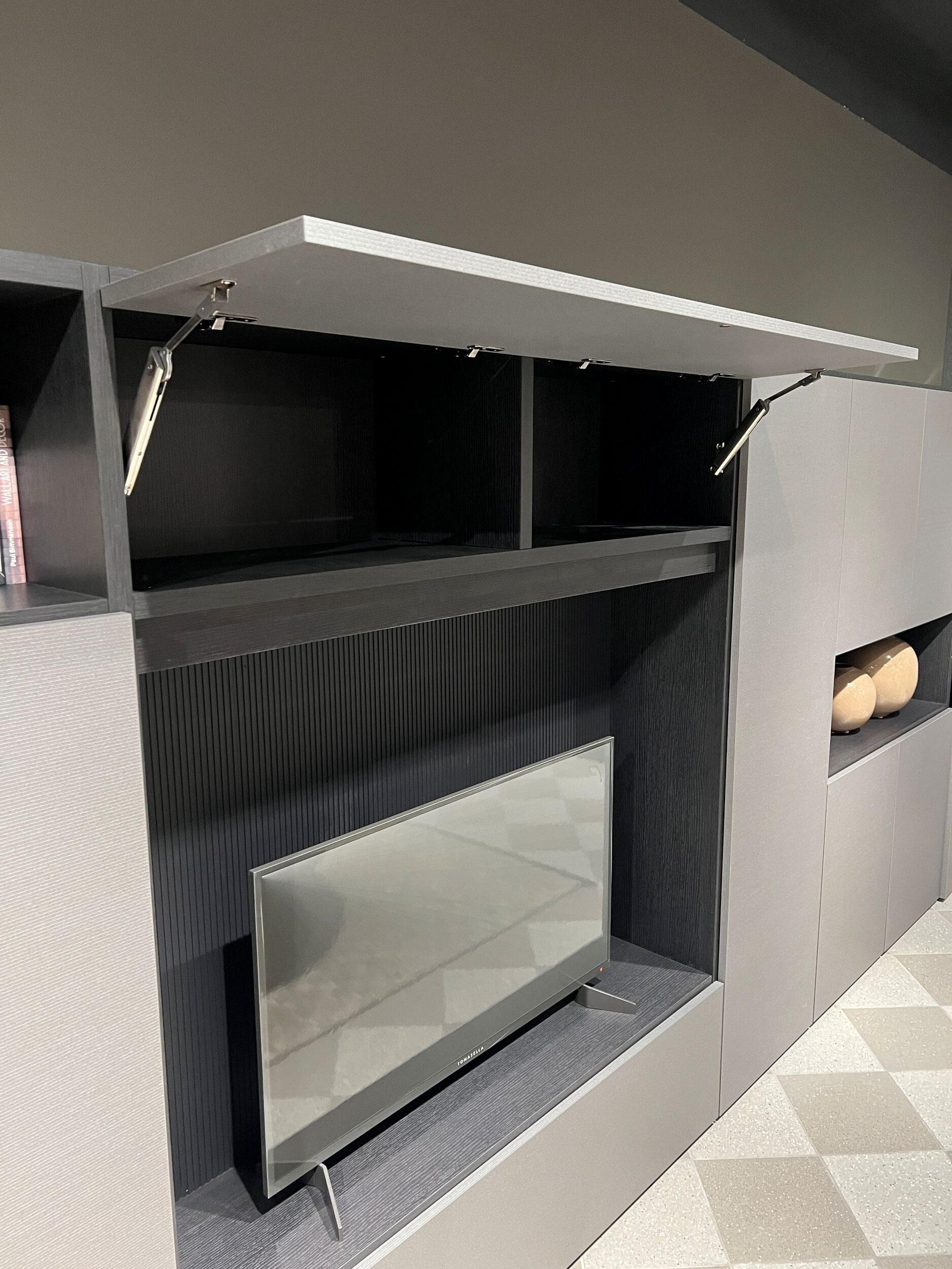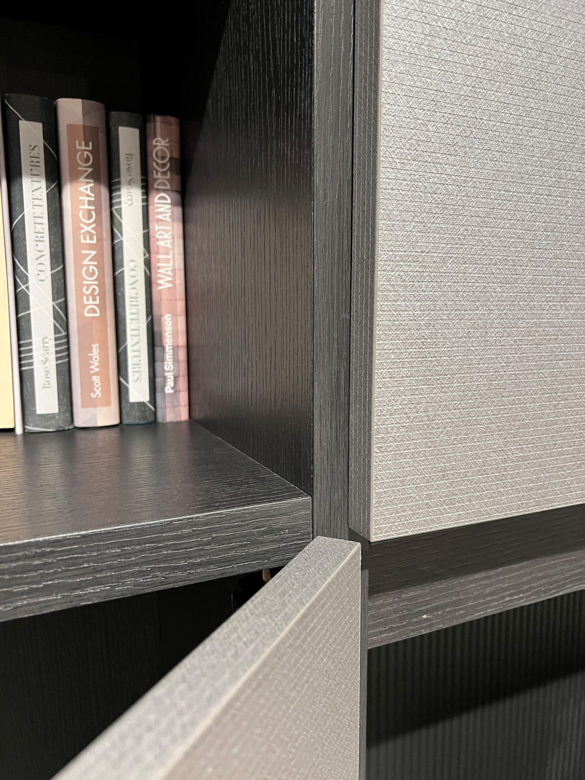 DETTAGLI E FINITURE: struttura libreria spalla in materico rovere carbone, frontali in materico effetto paglia grigio, pannello cannettato rovere carbone