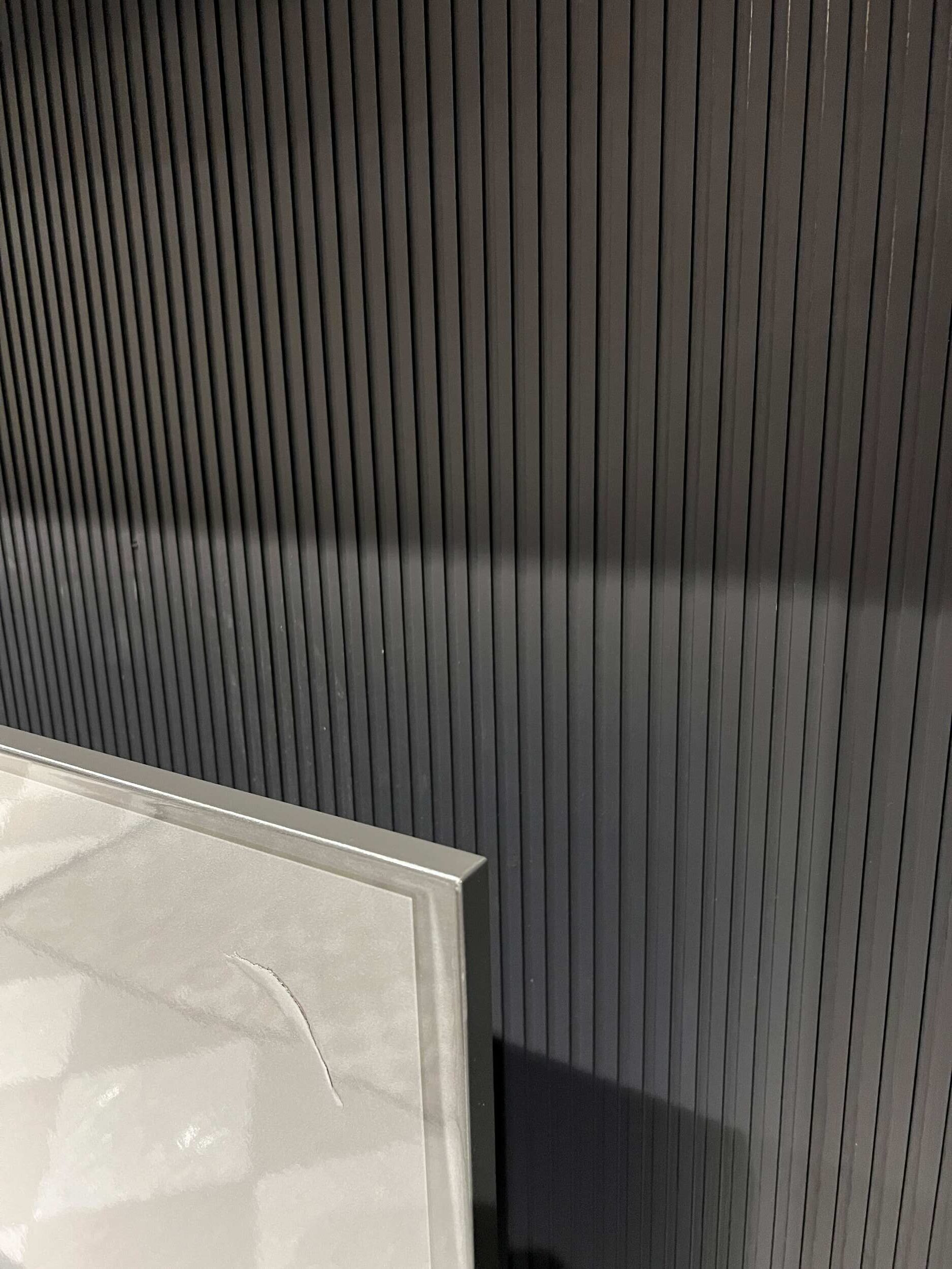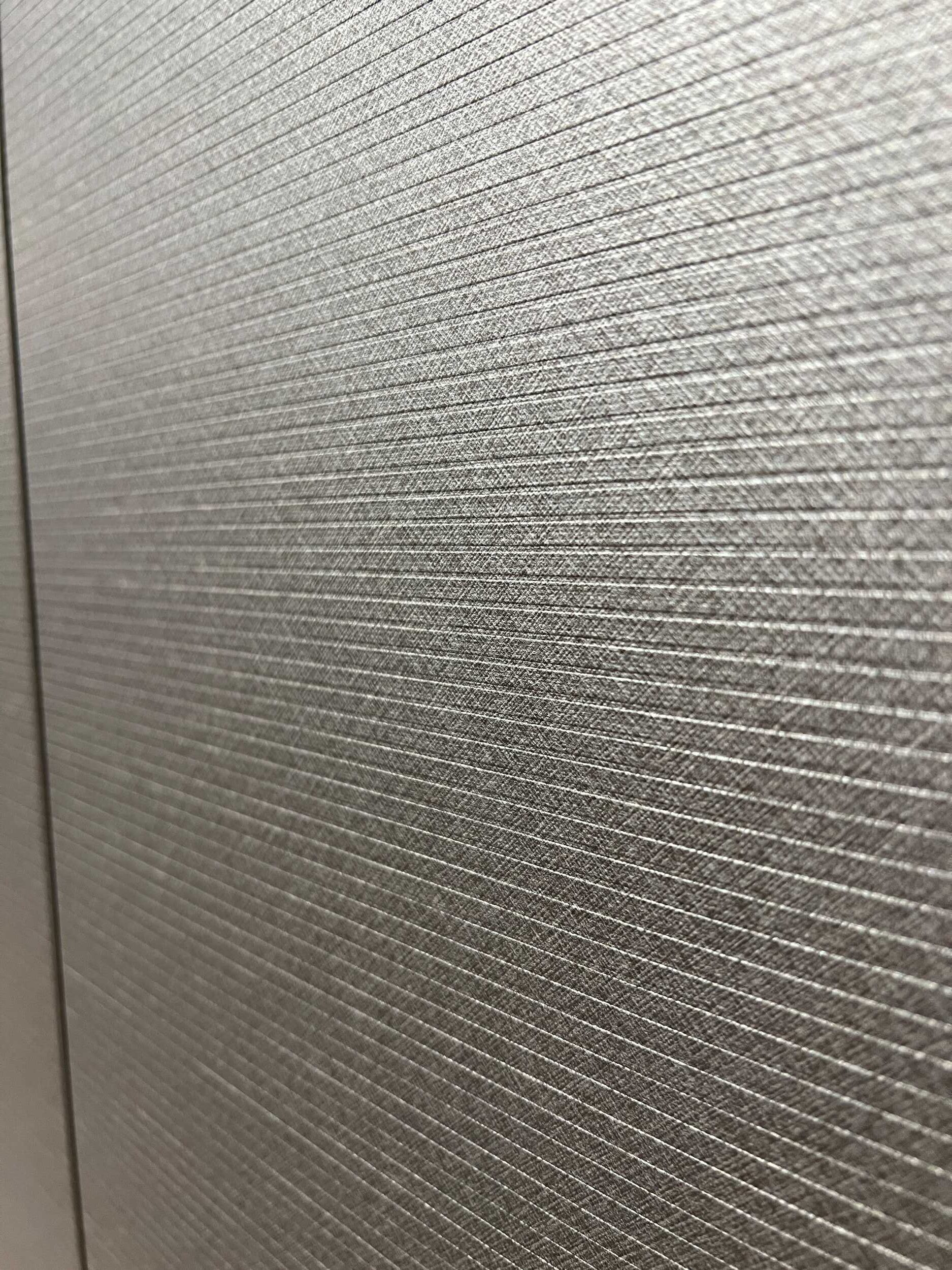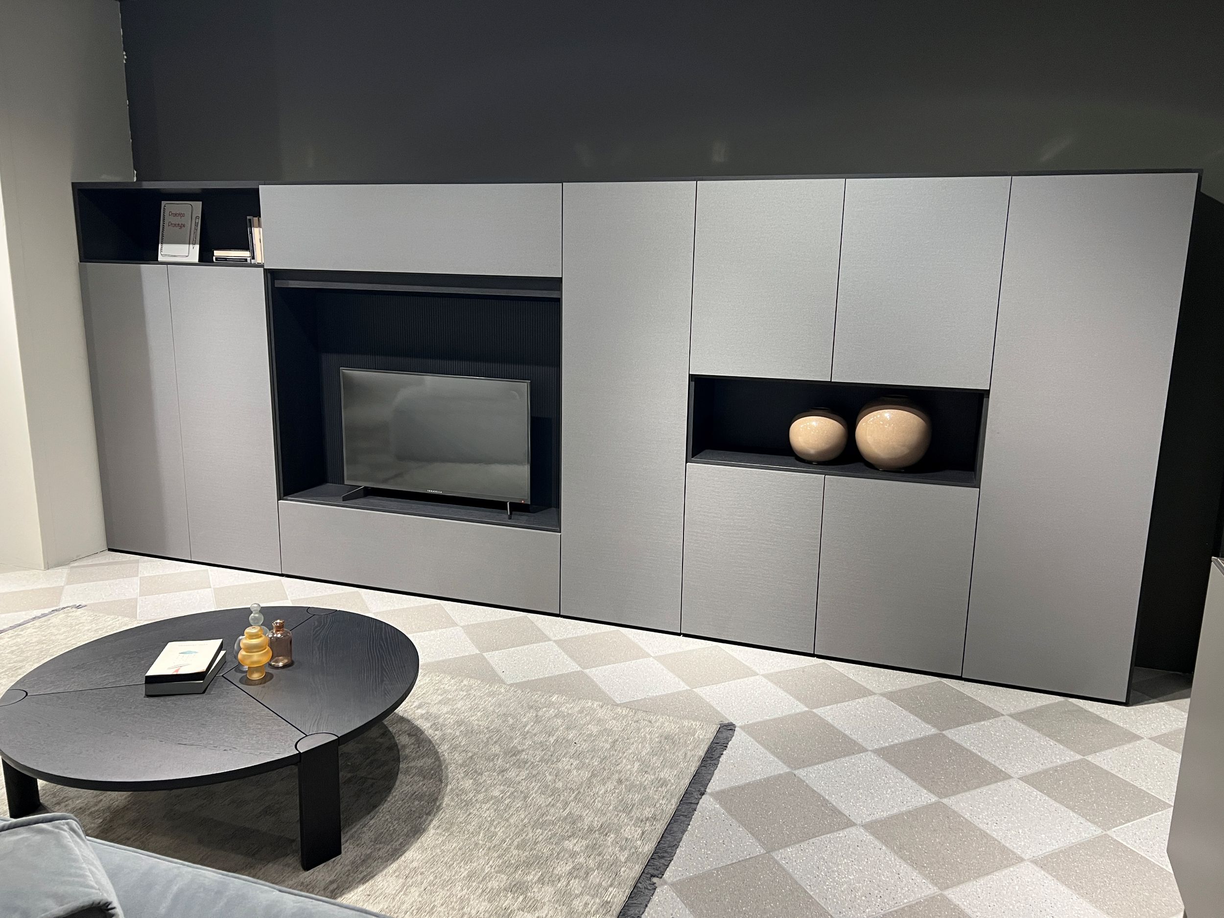 DETTAGLI E FINITURE: struttura libreria spalla in materico rovere carbone, frontali in materico effetto paglia grigio, pannello cannettato rovere carbone