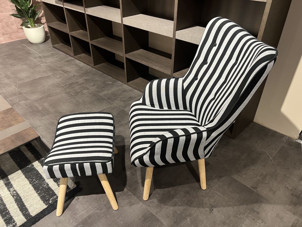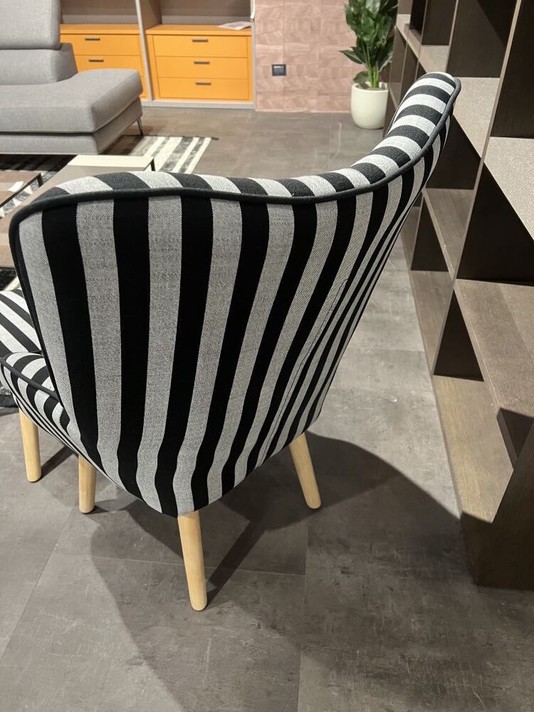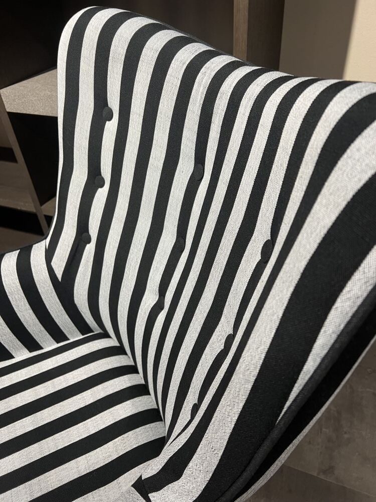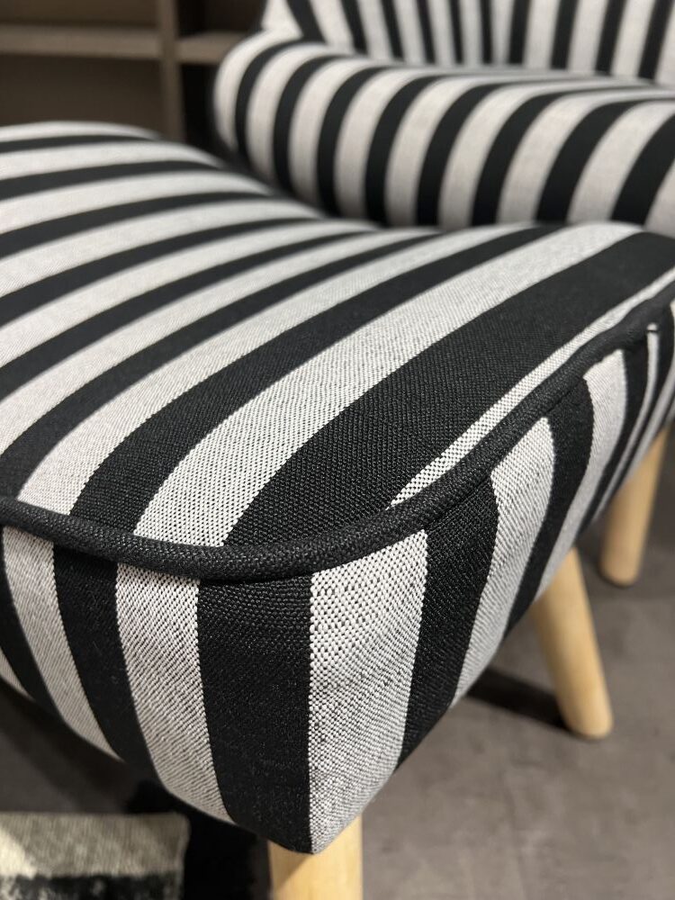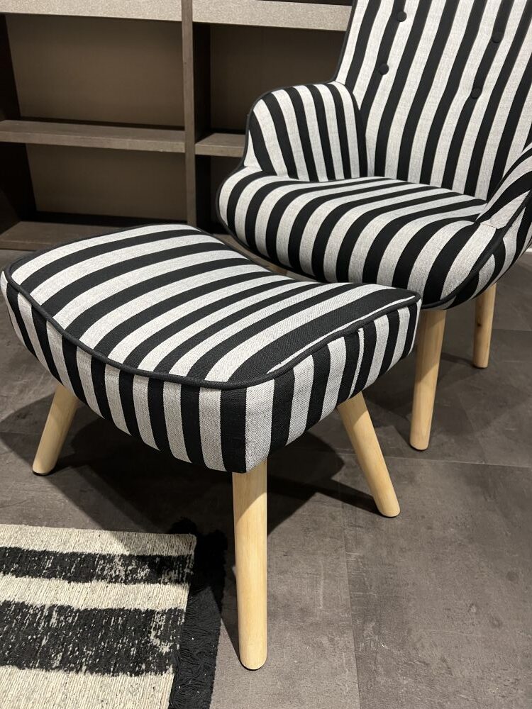 DETTAGLI E FINITURE: poltrona e pouf struttura in metallo gambe in legno imbottita in tessuto a righe