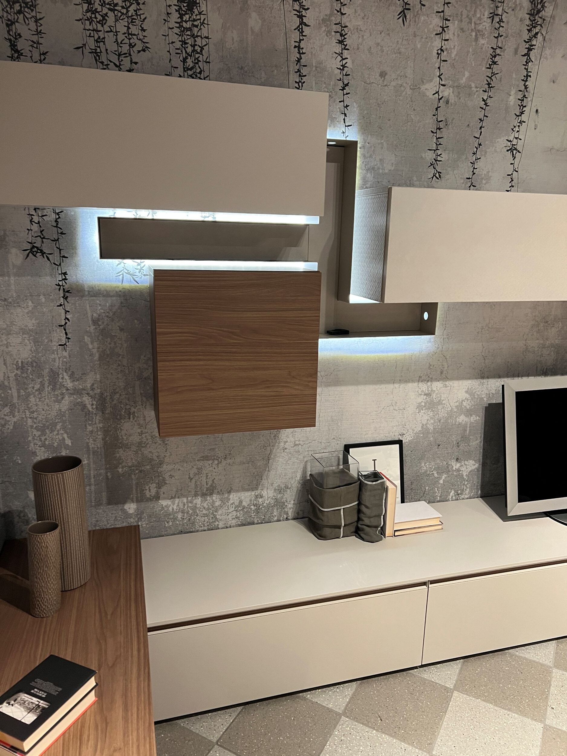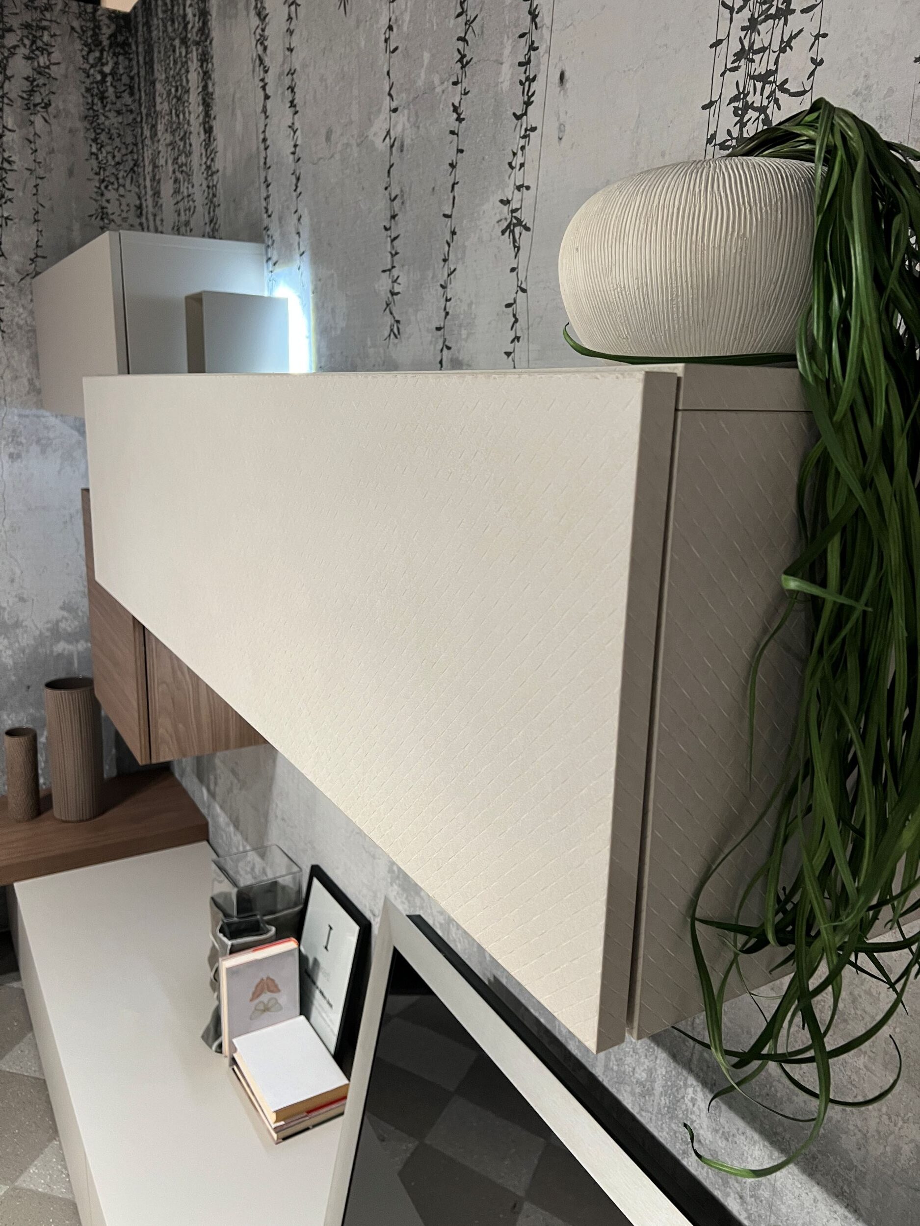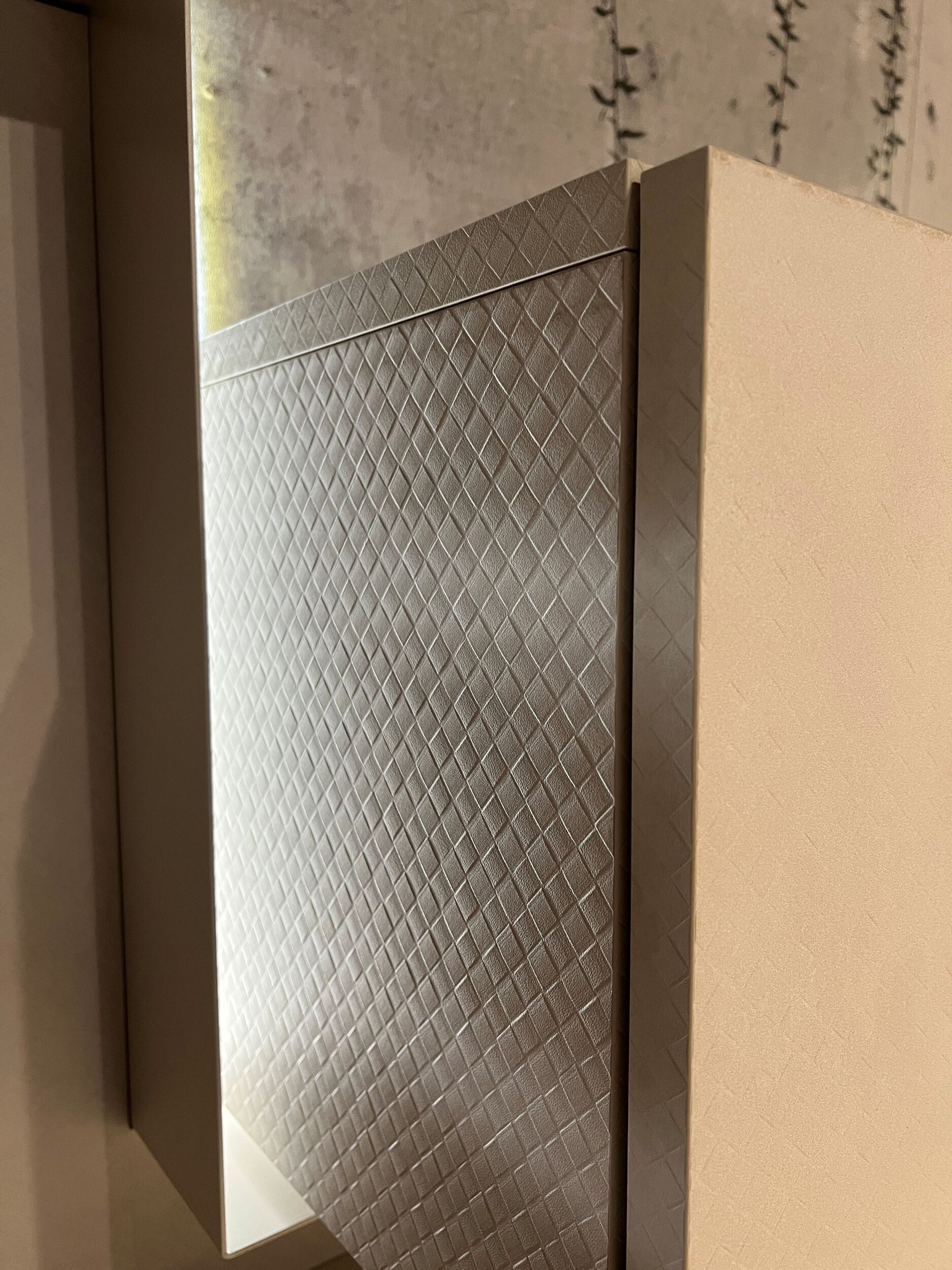 DETTAGLI E FINITURE: basi e pensile sinistro in finitura materico opaco madreperla, pensile destro in finitura materico effetto intreccio chiaro, pensile basso in finitura materico noce ambra. Maniglie basi in metallo finitura madreperla opaco e inserto materico noce ambra. Elemento di raccordo in metallo laccato madreperla e interno in finitura intreccio chiaro. Elemento panca in materico noce ambra. Completo di luce led.