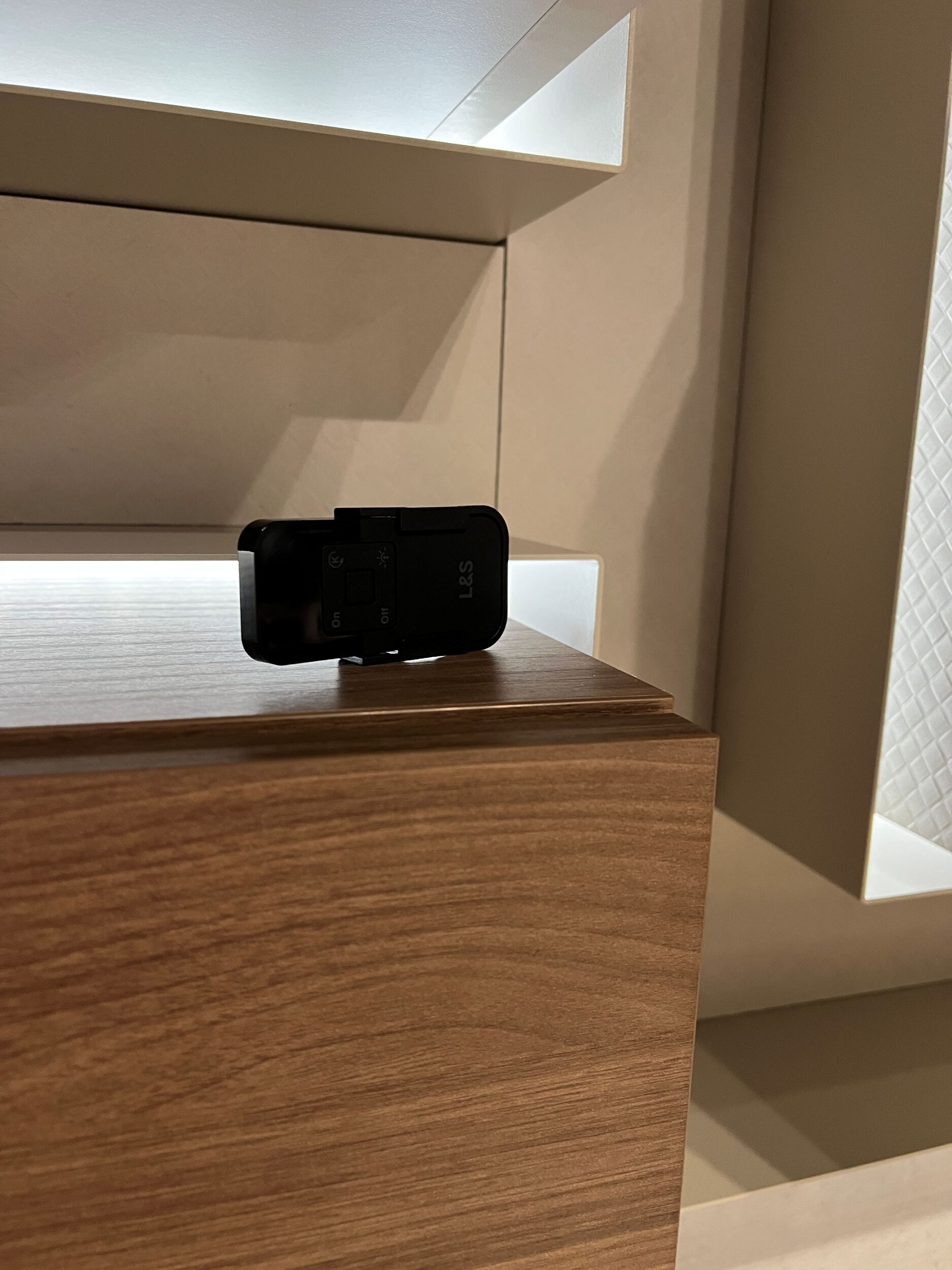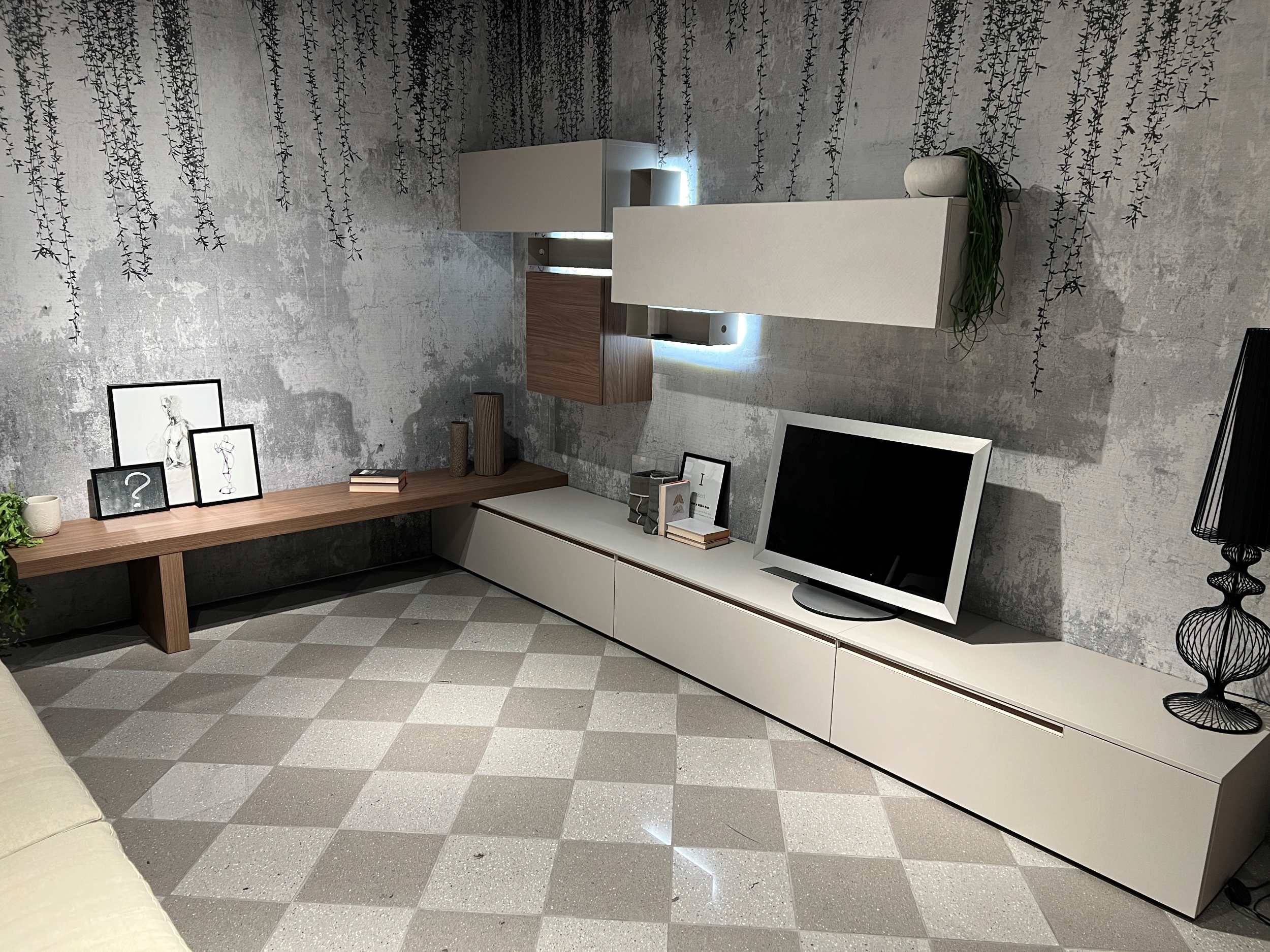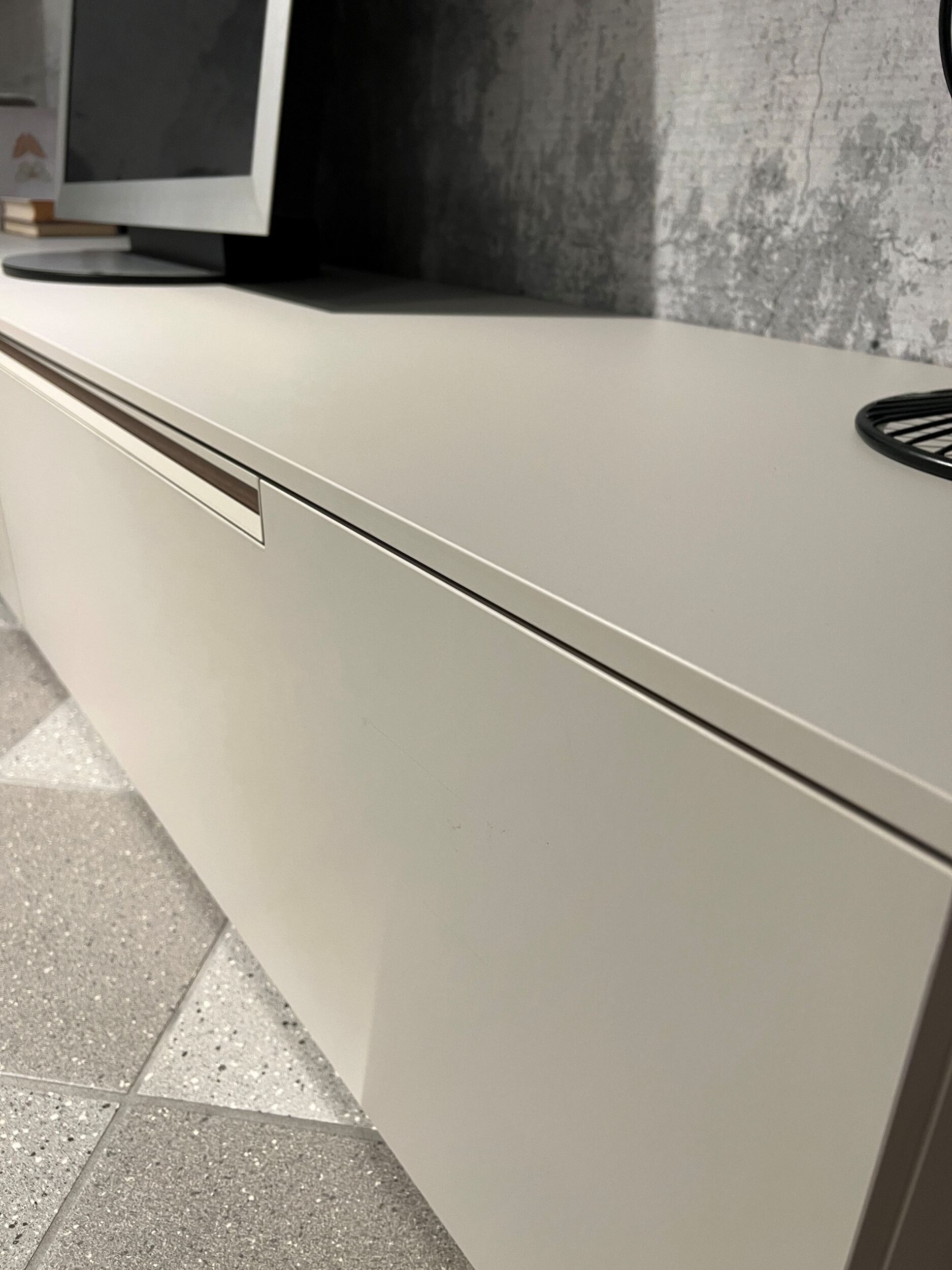 DETTAGLI E FINITURE: basi e pensile sinistro in finitura materico opaco madreperla, pensile destro in finitura materico effetto intreccio chiaro, pensile basso in finitura materico noce ambra. Maniglie basi in metallo finitura madreperla opaco e inserto materico noce ambra. Elemento di raccordo in metallo laccato madreperla e interno in finitura intreccio chiaro. Elemento panca in materico noce ambra. Completo di luce led.