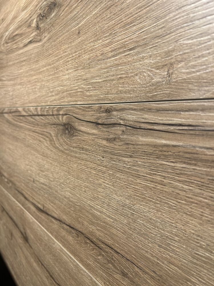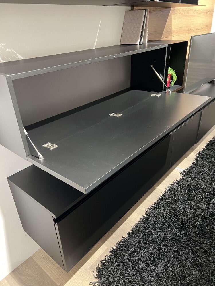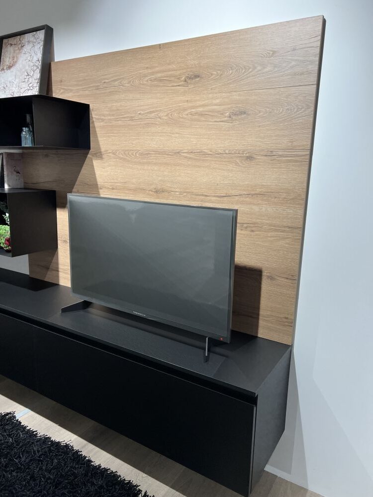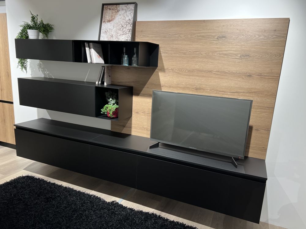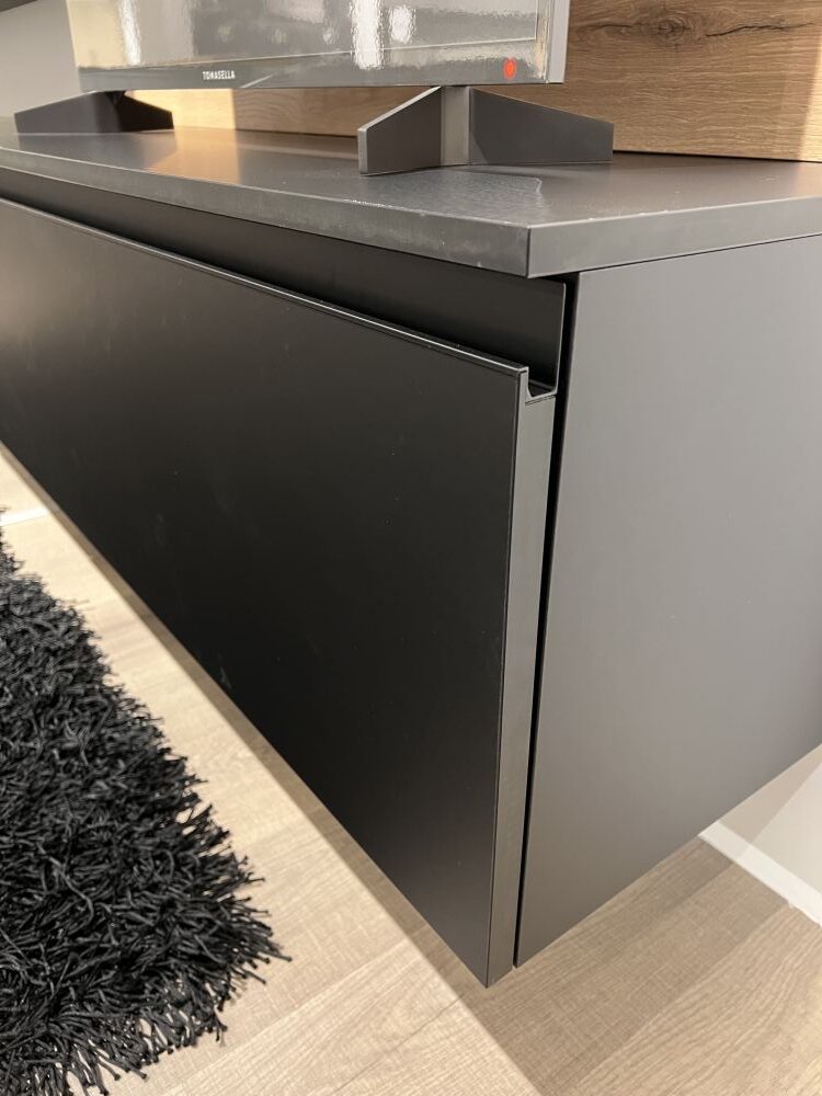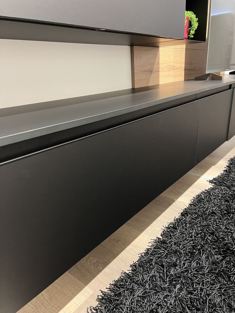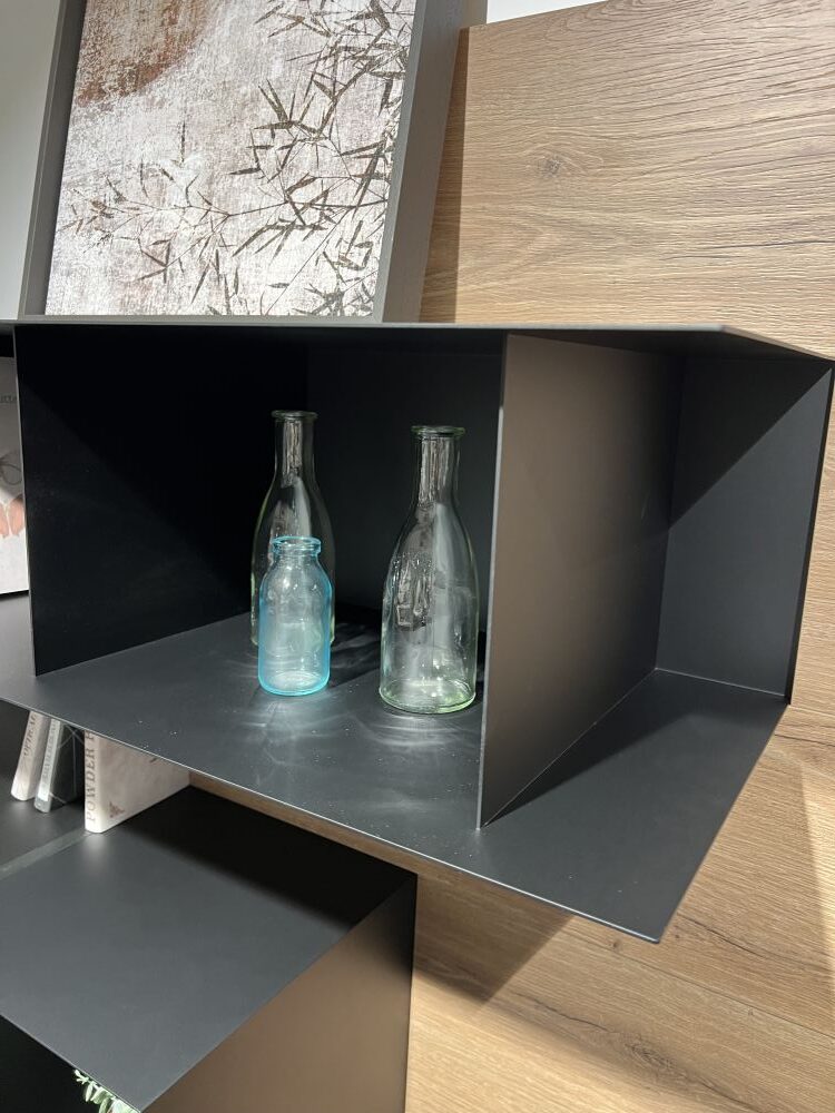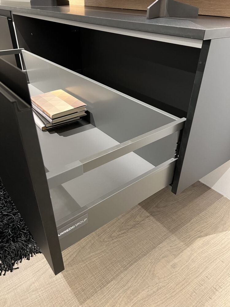 DETTAGLI E FINITURE: finitura in fenix colore nero, elementi a giorno metallici in finitura nero, maniglie finitura nero, pannelli a muro in laminato finitura rovere cuoio