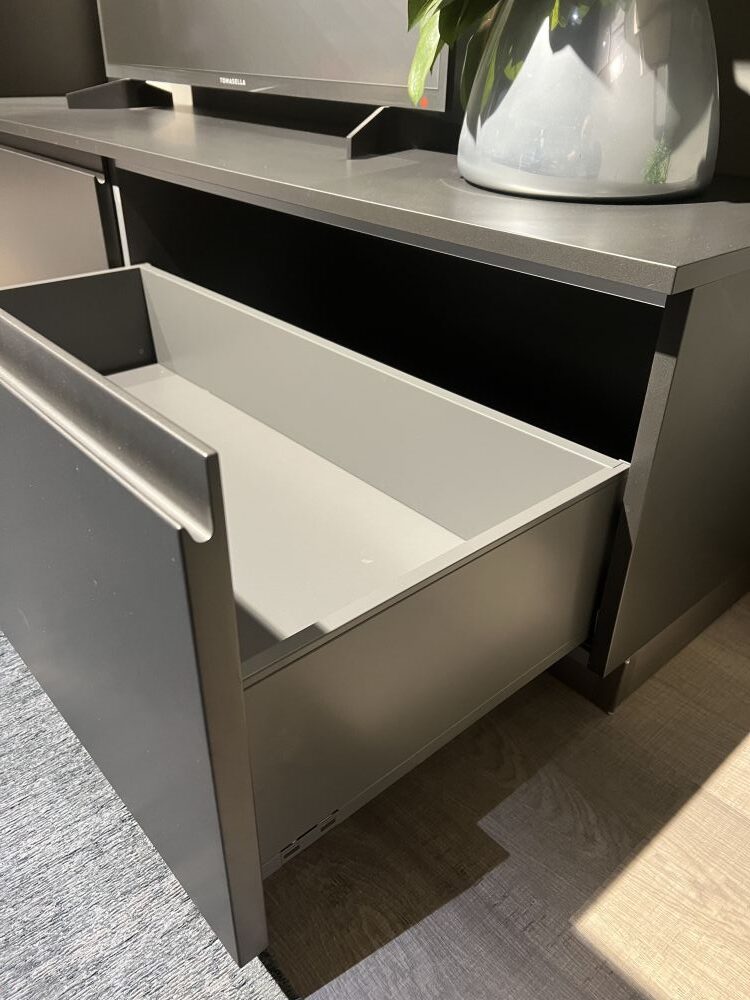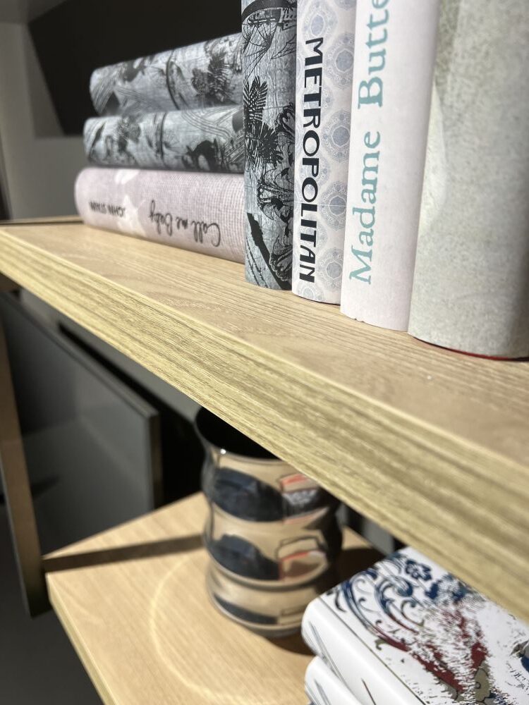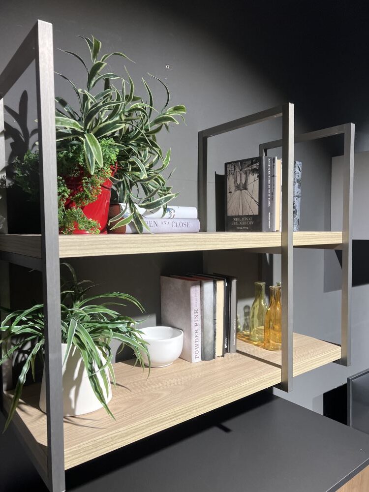 DETTAGLI E FINITURE: Soggiorno con frontali basi a terra finitura metallizzato brunito, elementi a giorno in metallizzato ossidato mensole in rovere canapa, pensili bianchi.
