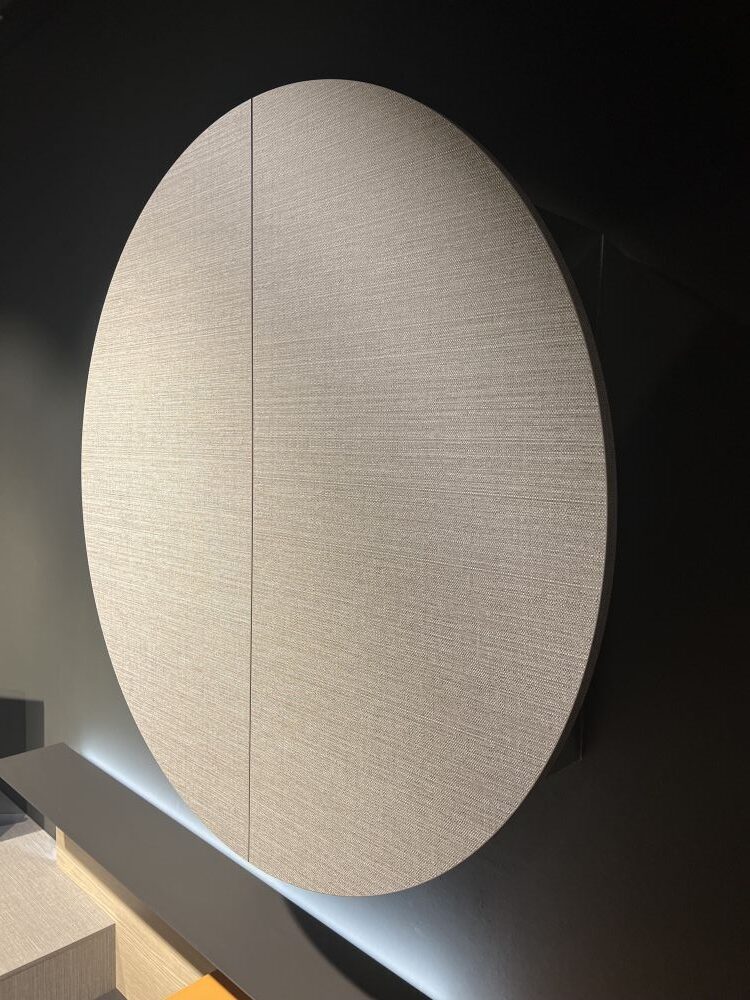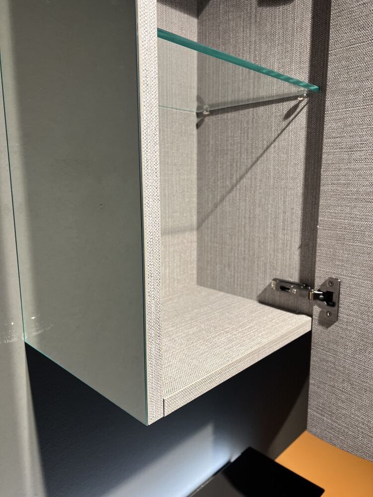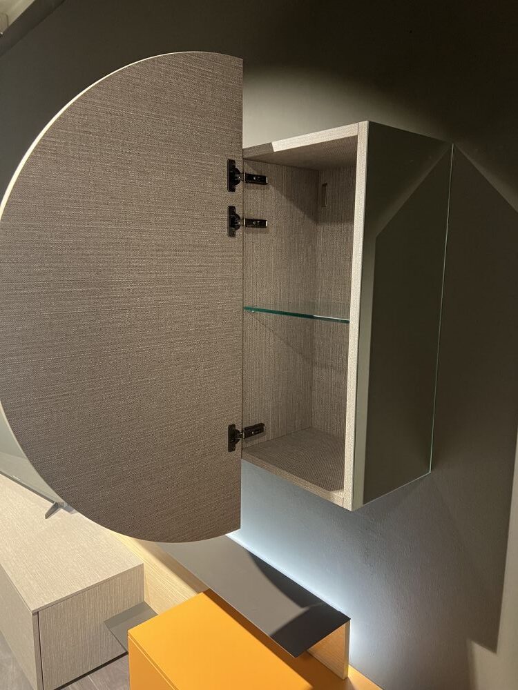 DETTAGLI E FINITURE: finiture laccato Terracotta, materico Alpaca, boiserie materico rovere sabbia con led. Pensile mod. Dot con specchi laterali.