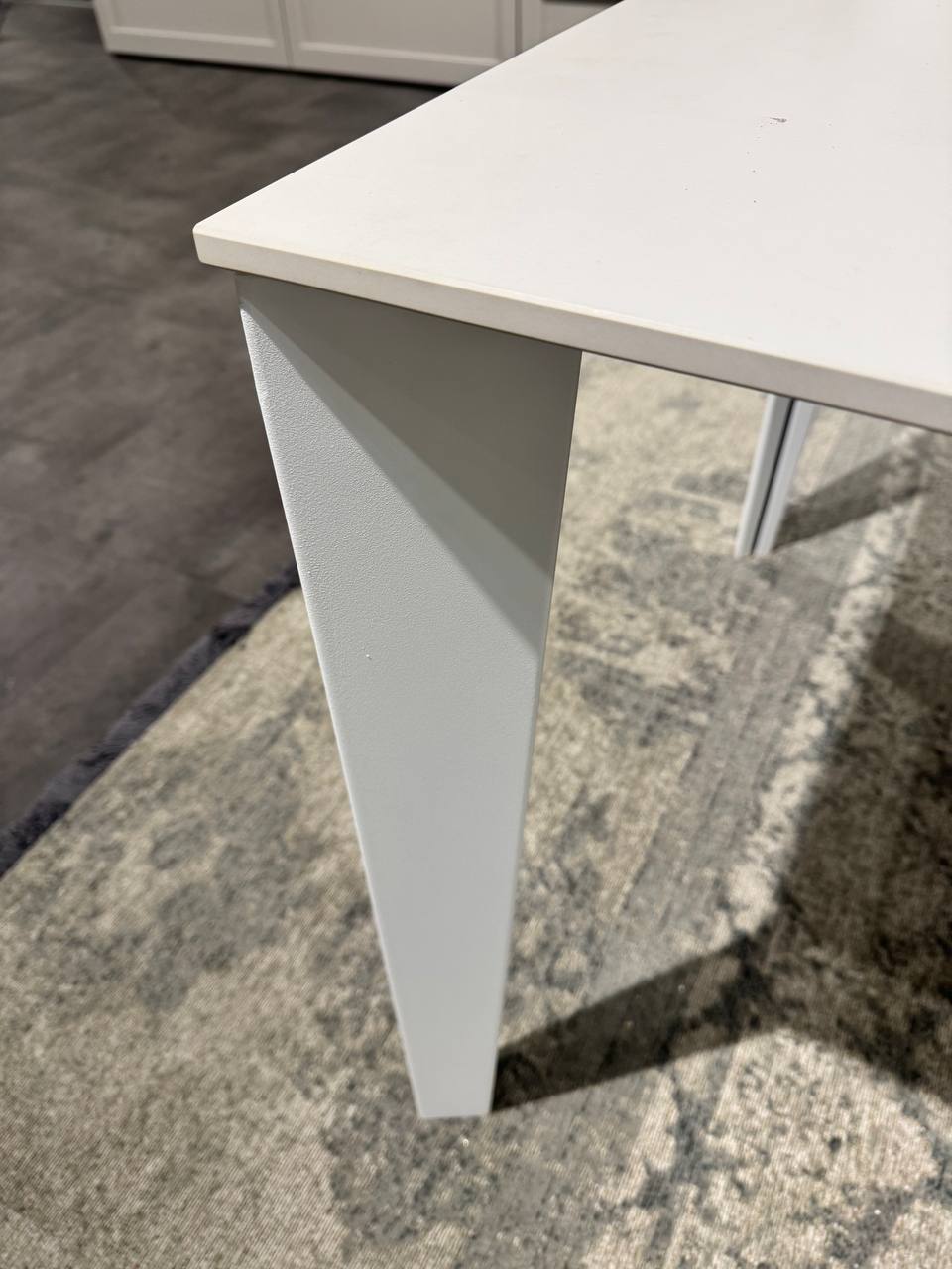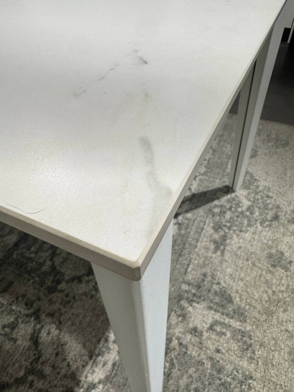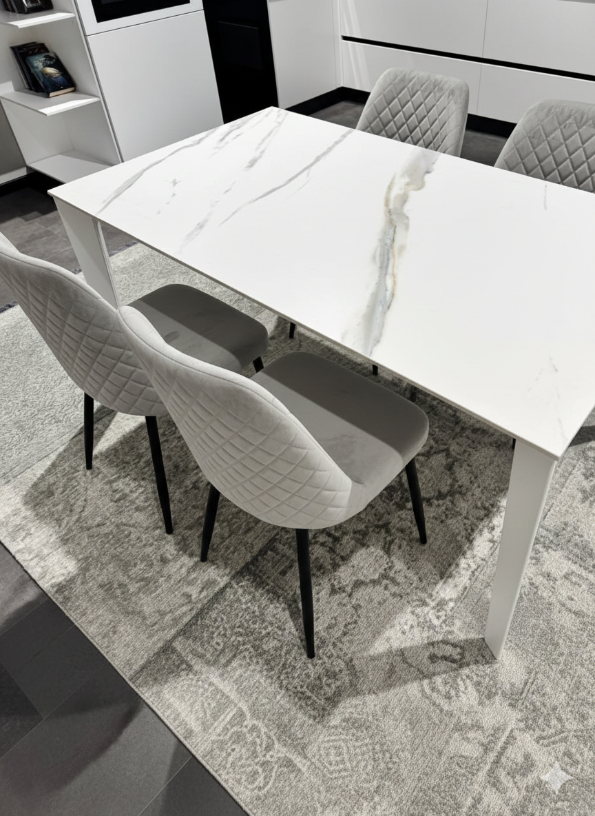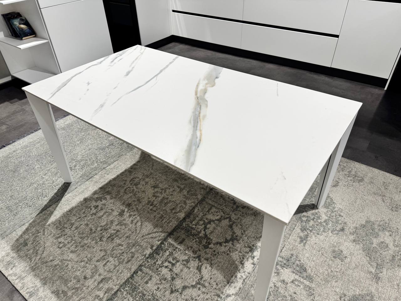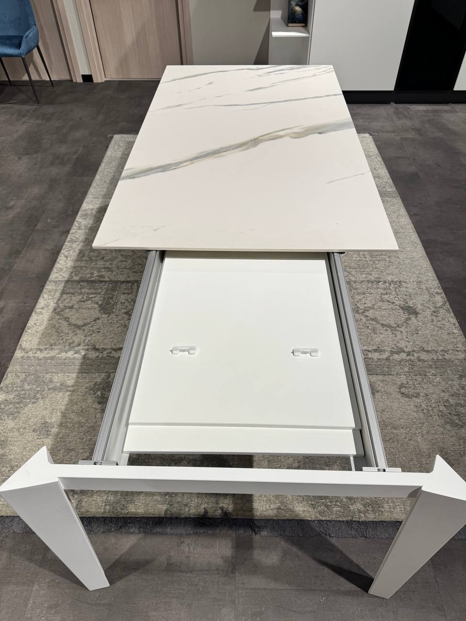 DETTAGLI E FINITURE: piano top in finitura gres effetto marmo calacatta, basamento e gambe in metallo bianco opaco