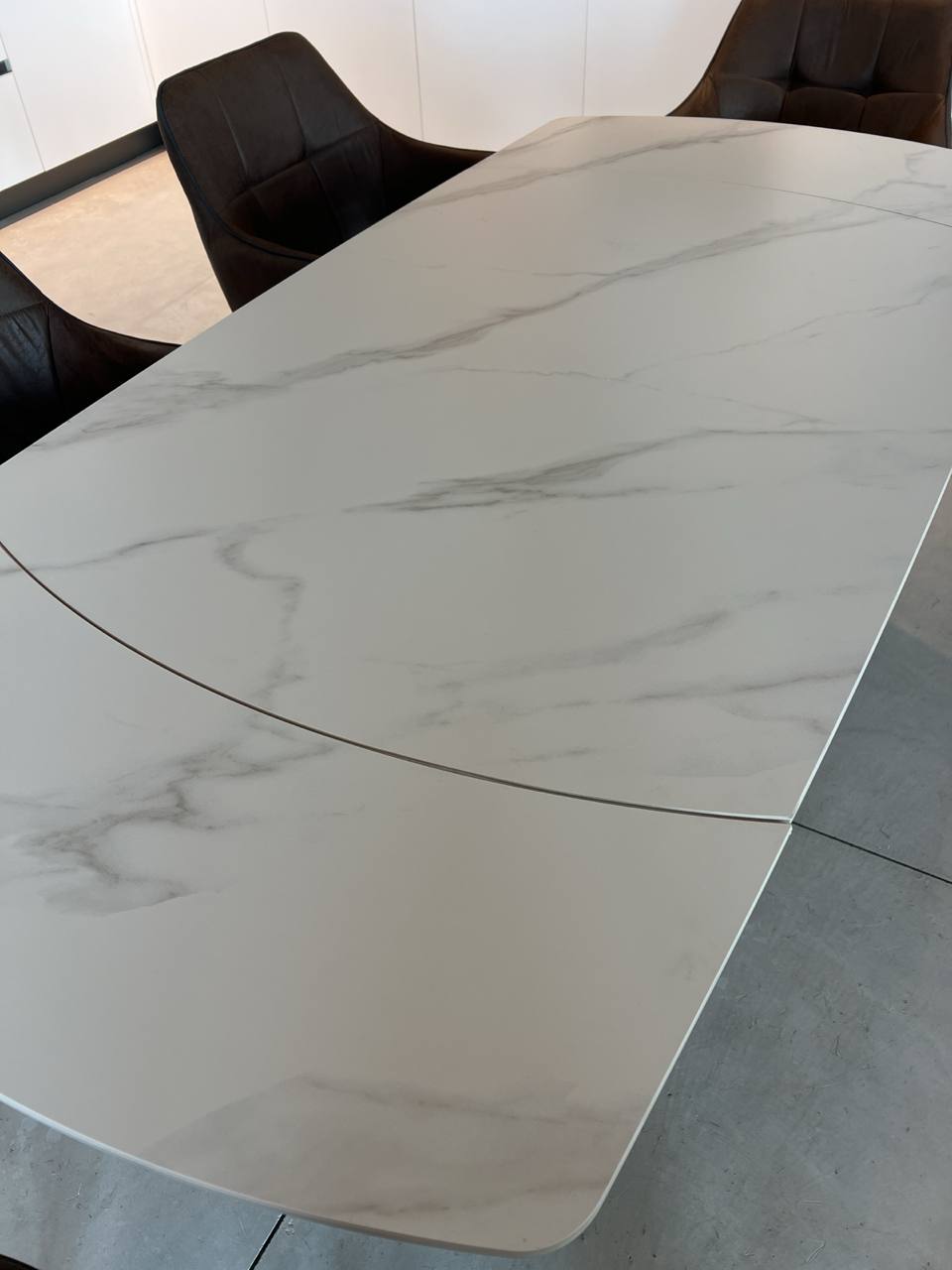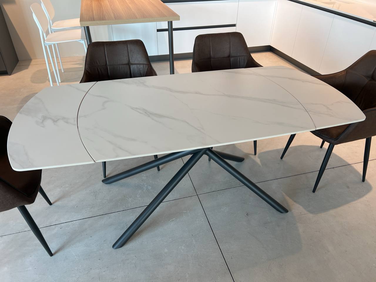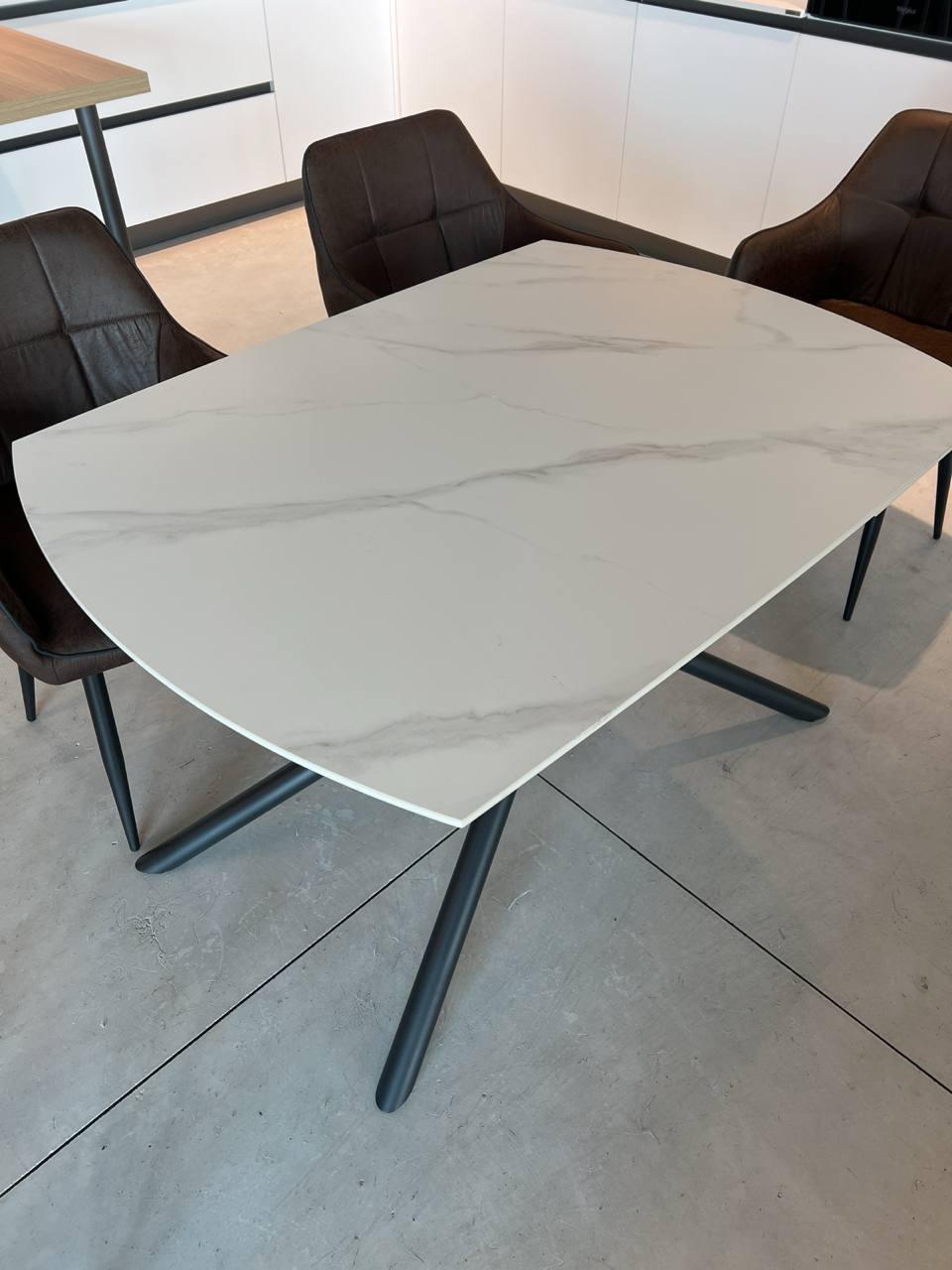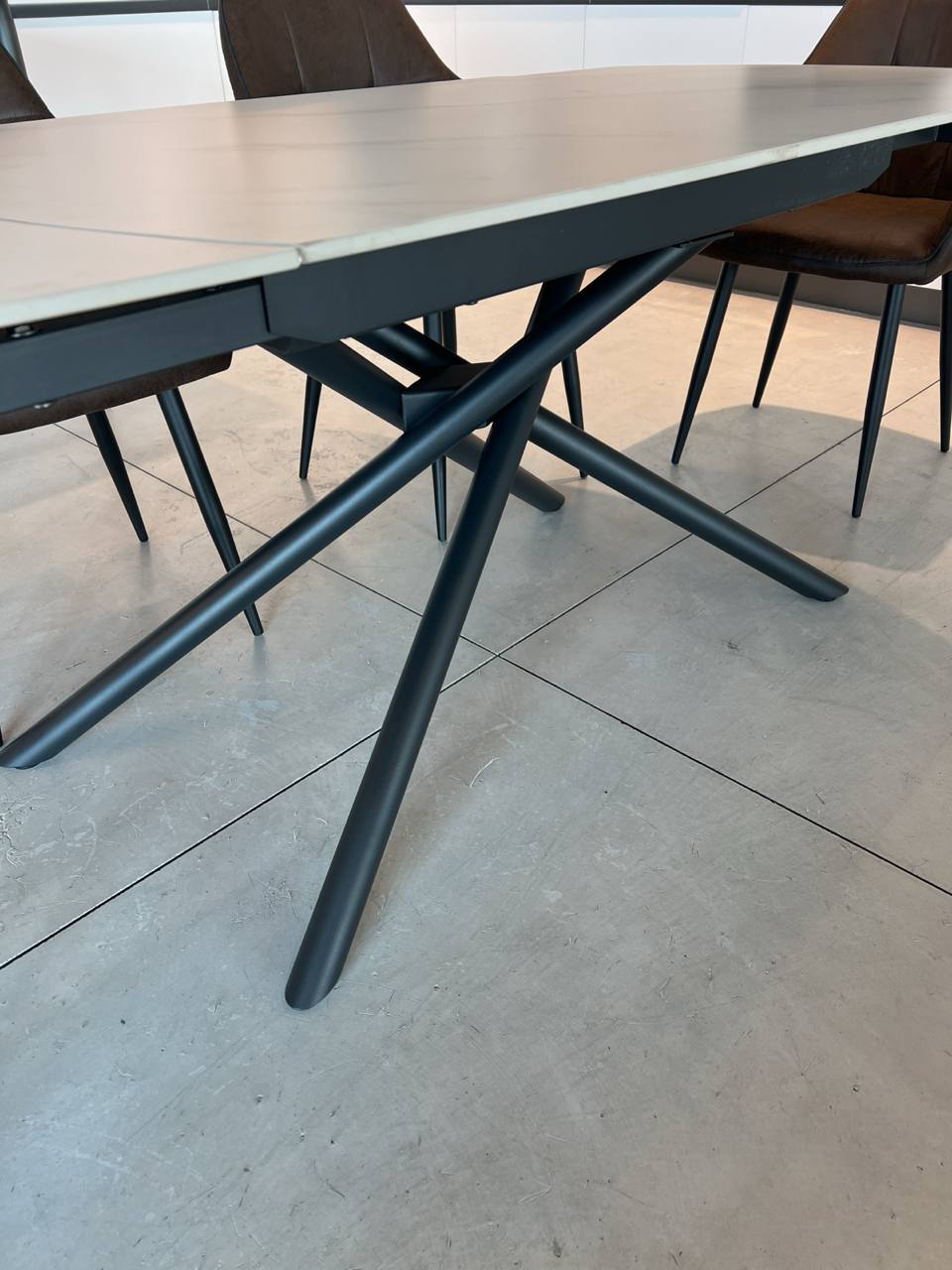 DETTAGLI E FINITURE: piano in gres, struttura e gambe intrecciate tubolari in metallo opaco nero