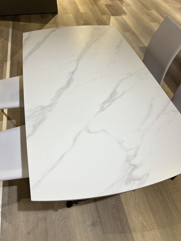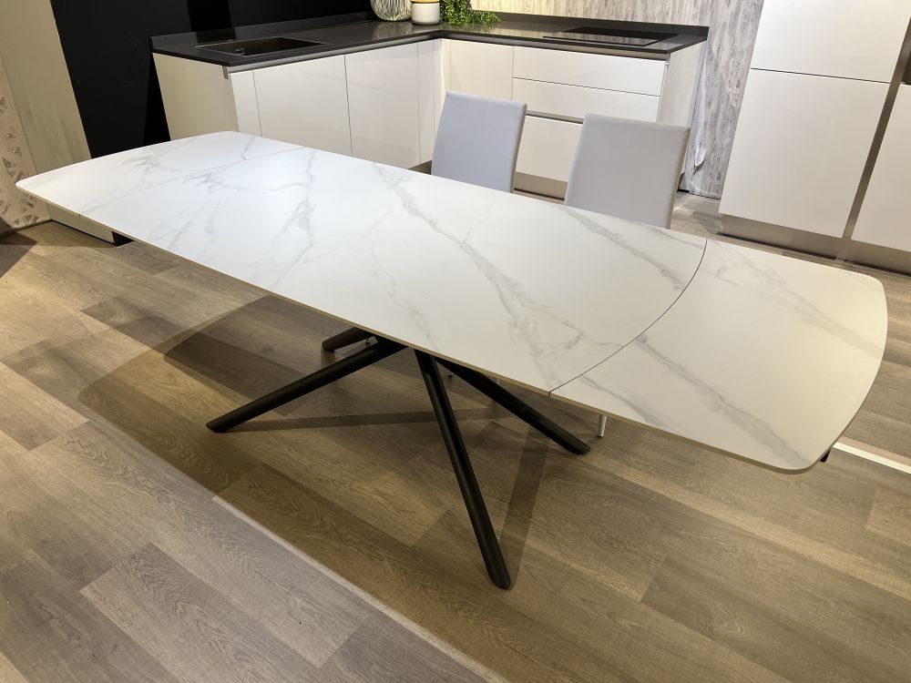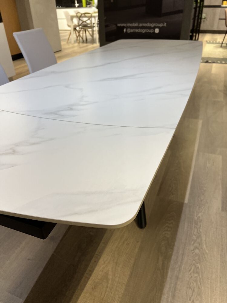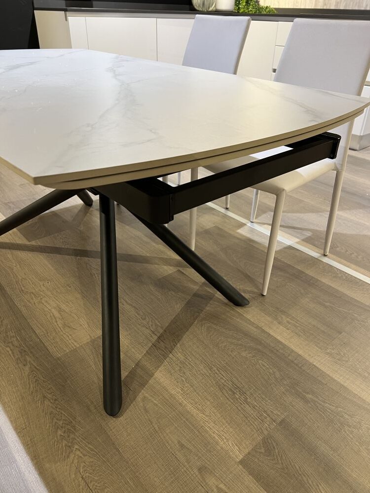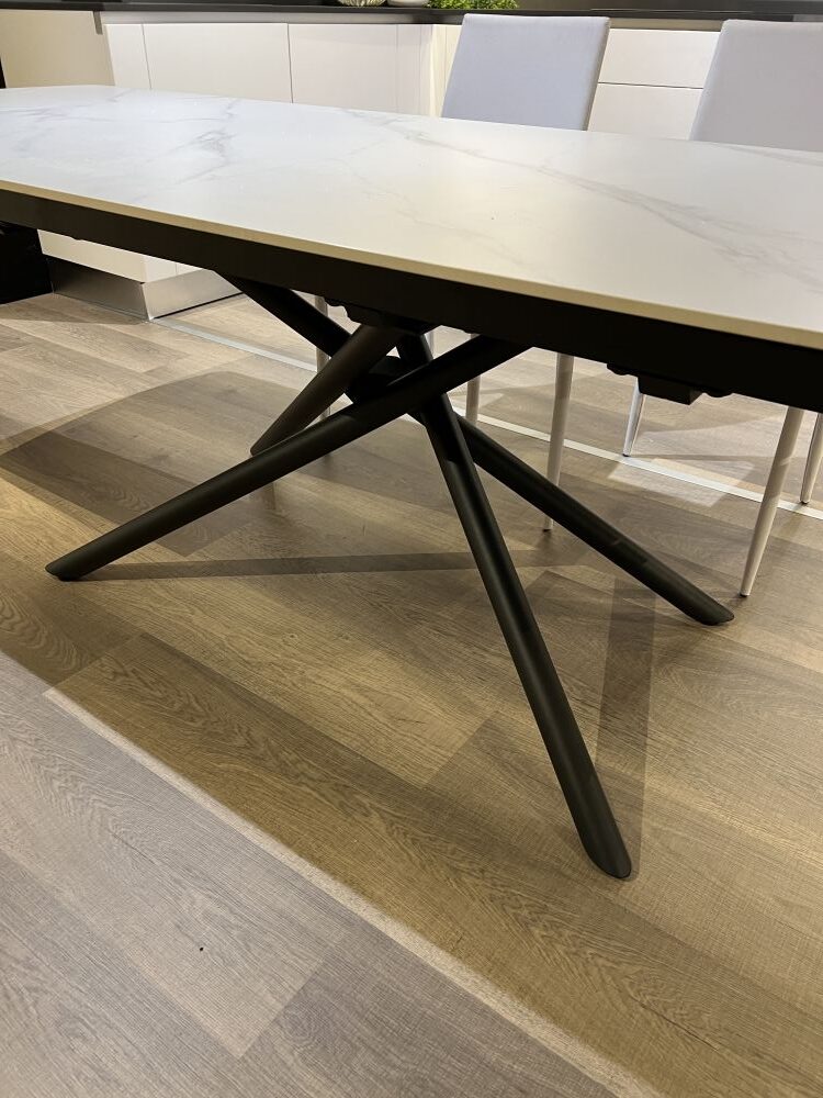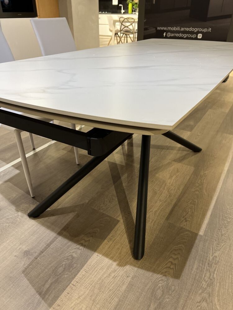 DETTAGLI E FINITURE: tavolo allungabile con piano in gres e gambe in metallo opaco