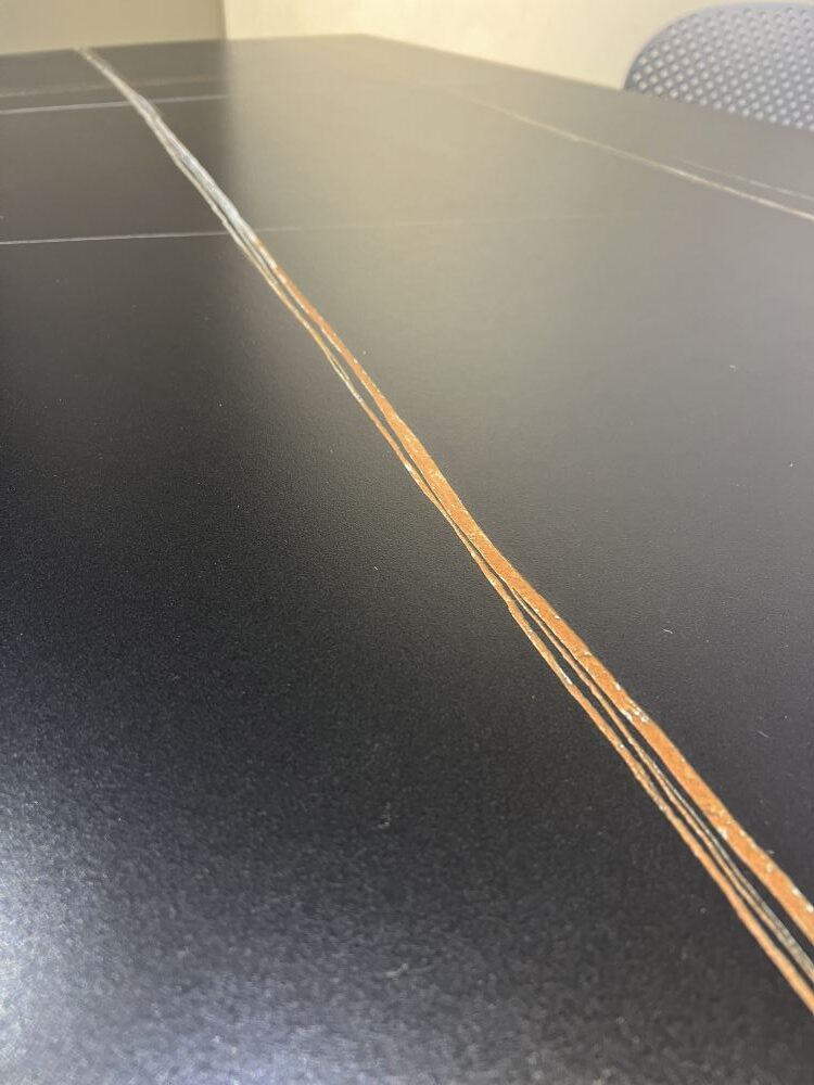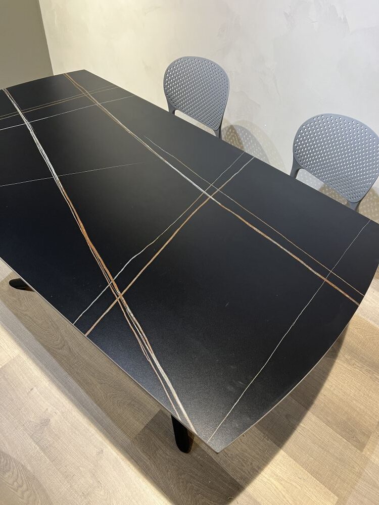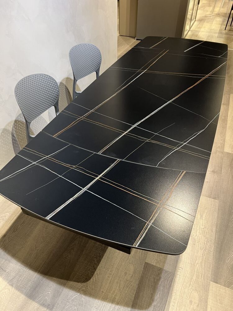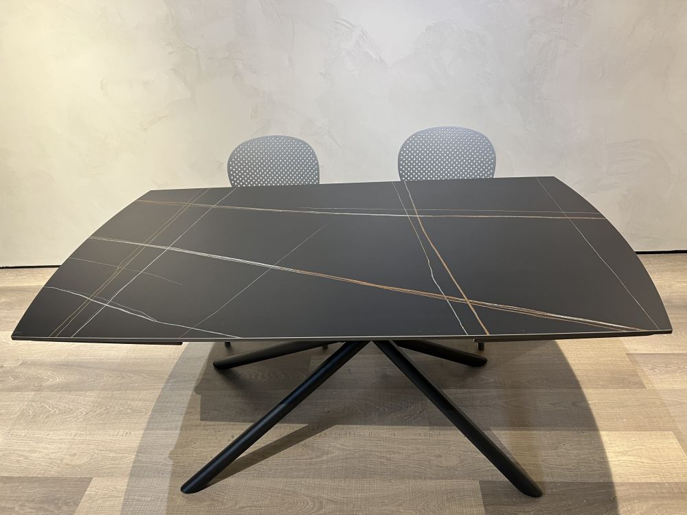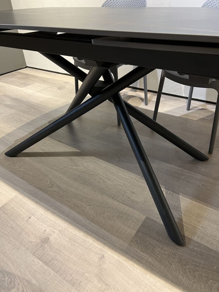 DETTAGLI E FINITURE: tavolo allungabile con piano in gres e gambe in metallo opaco. Apertura con allunghe a rotazione