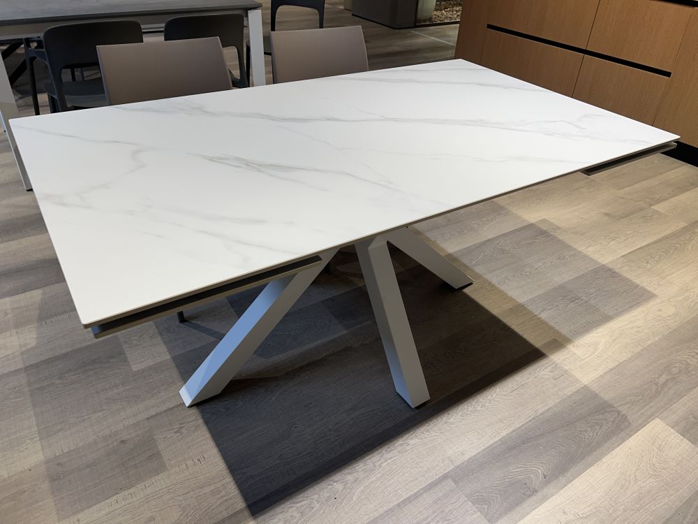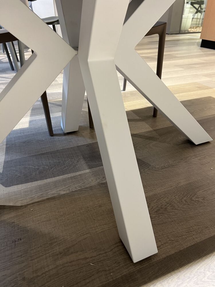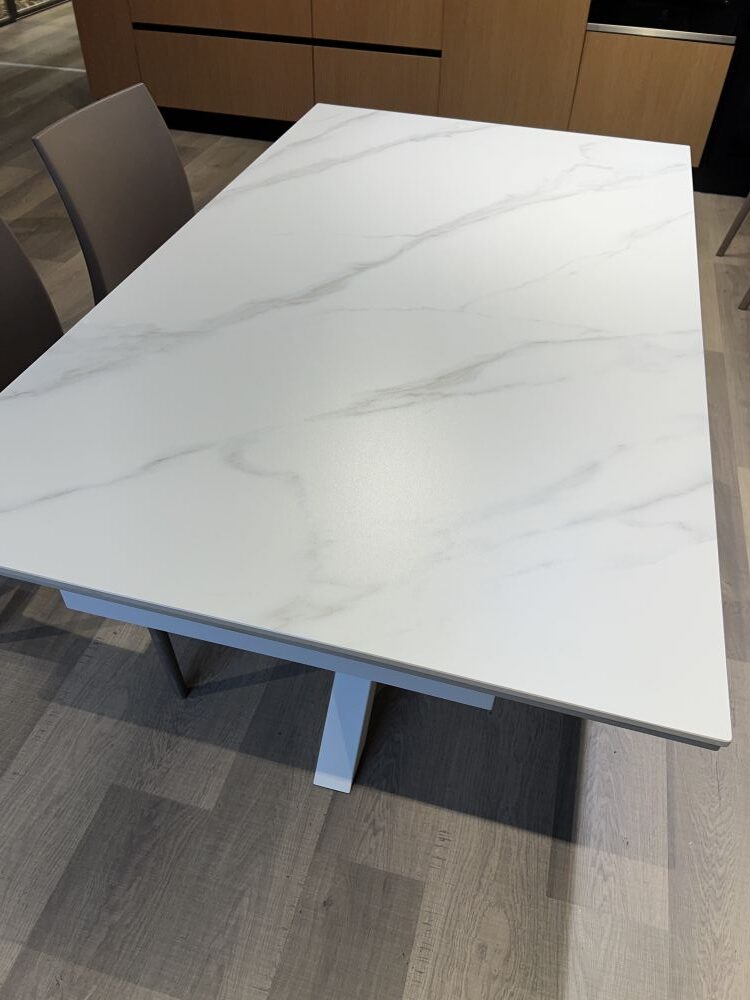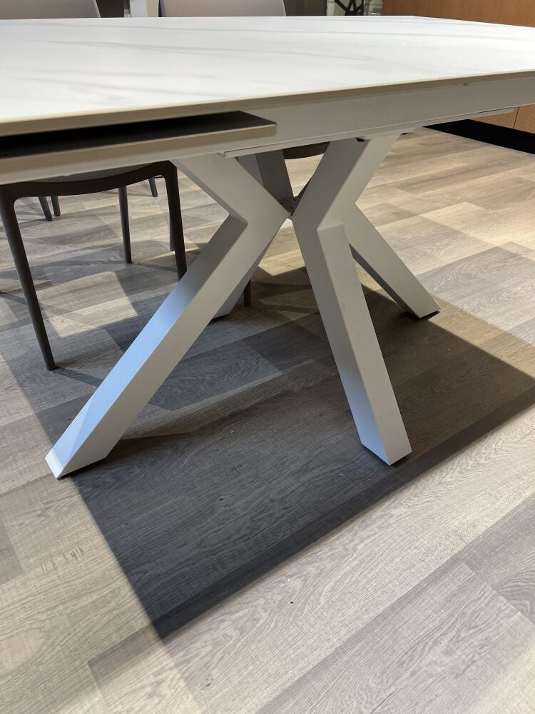 DETTAGLI E FINITURE: tavolo con allunghe laterali, gambe in metallo opaco bianco stone e con piano in gres