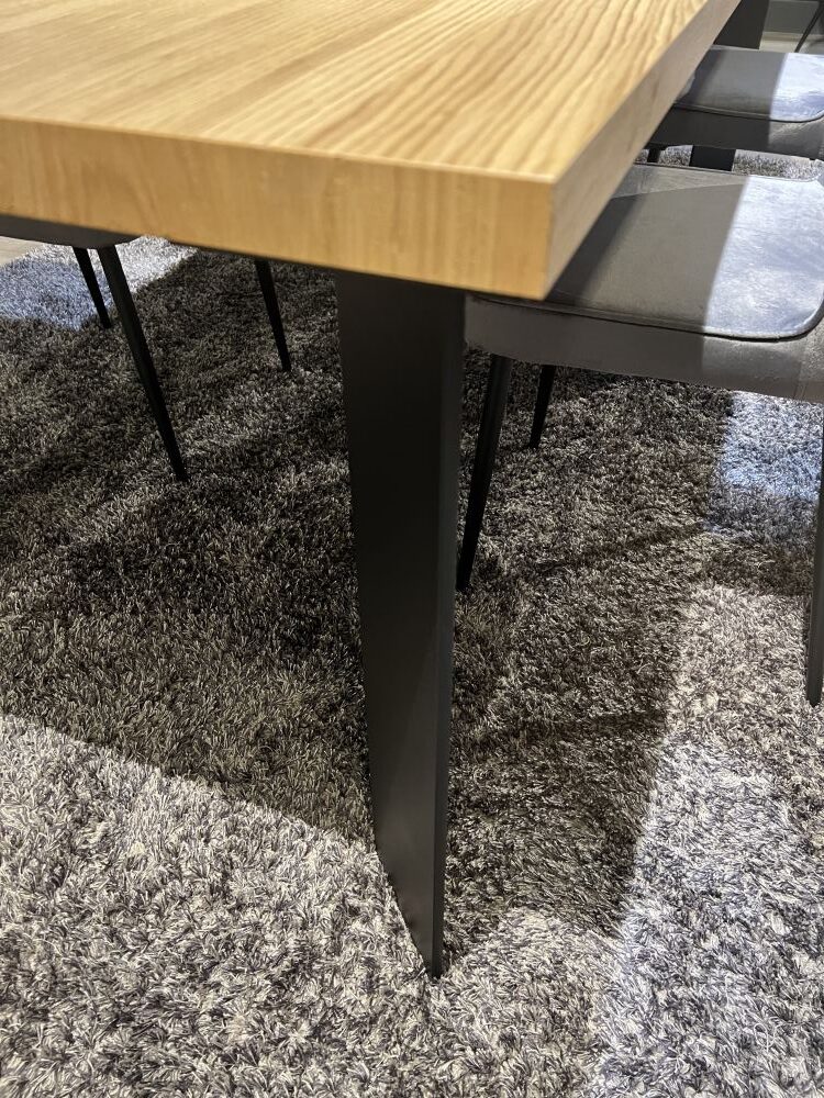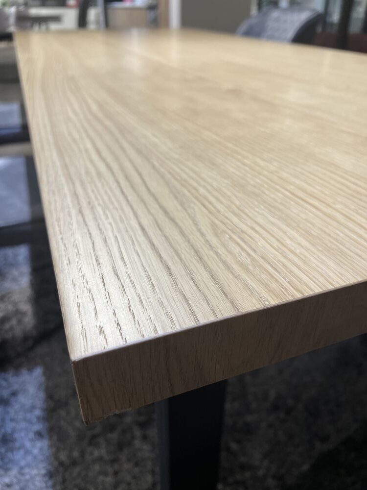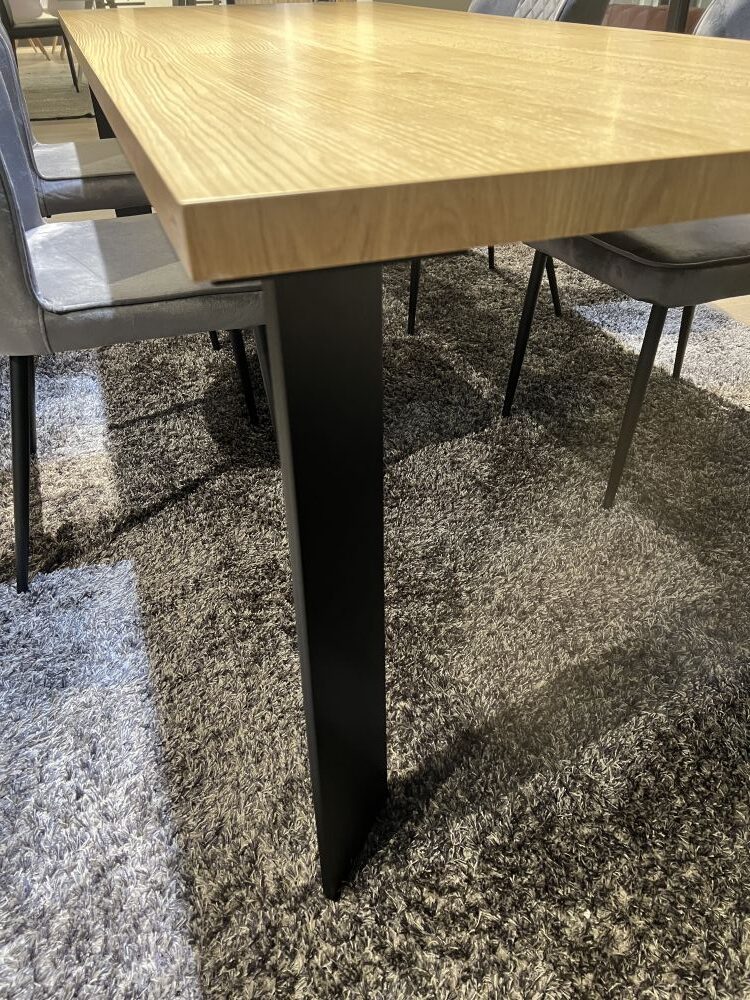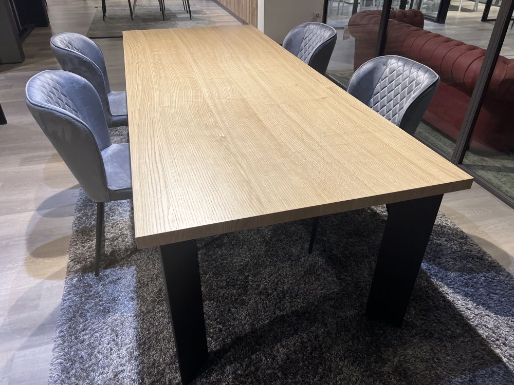 DETTAGLI E FINITURE: tavolo base in metallo con piano finitura rovere 1918 spessore 4 cm. Gambe in ferro