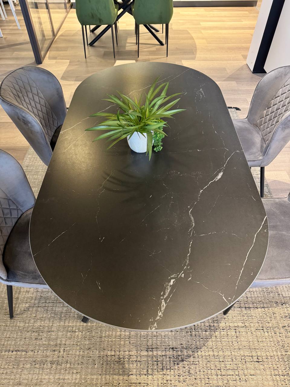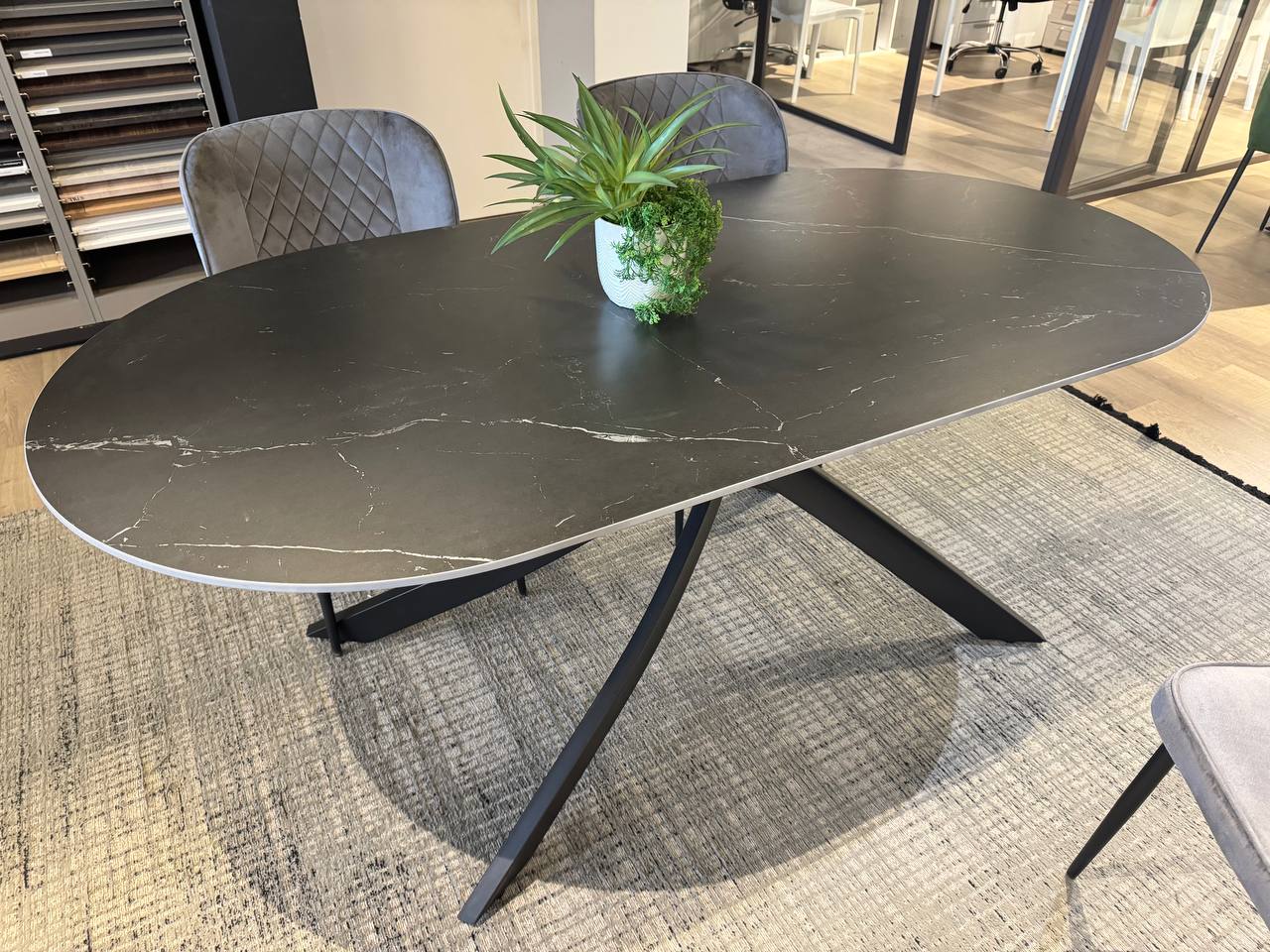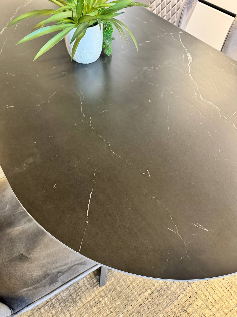 DETTAGLI E FINITURE: piano top in finitura gres effetto marmo, basamento centrale in metallo nero opaco
